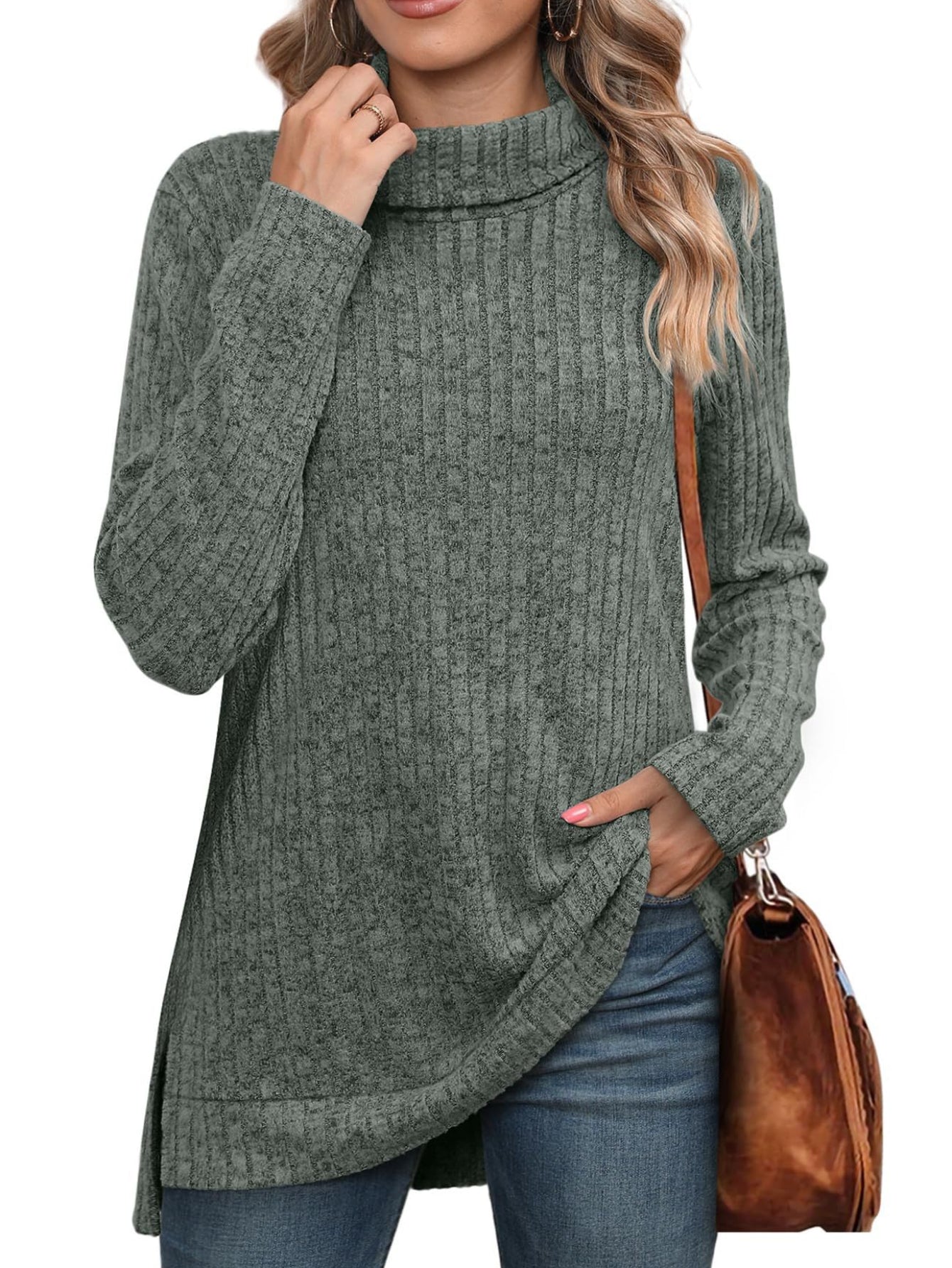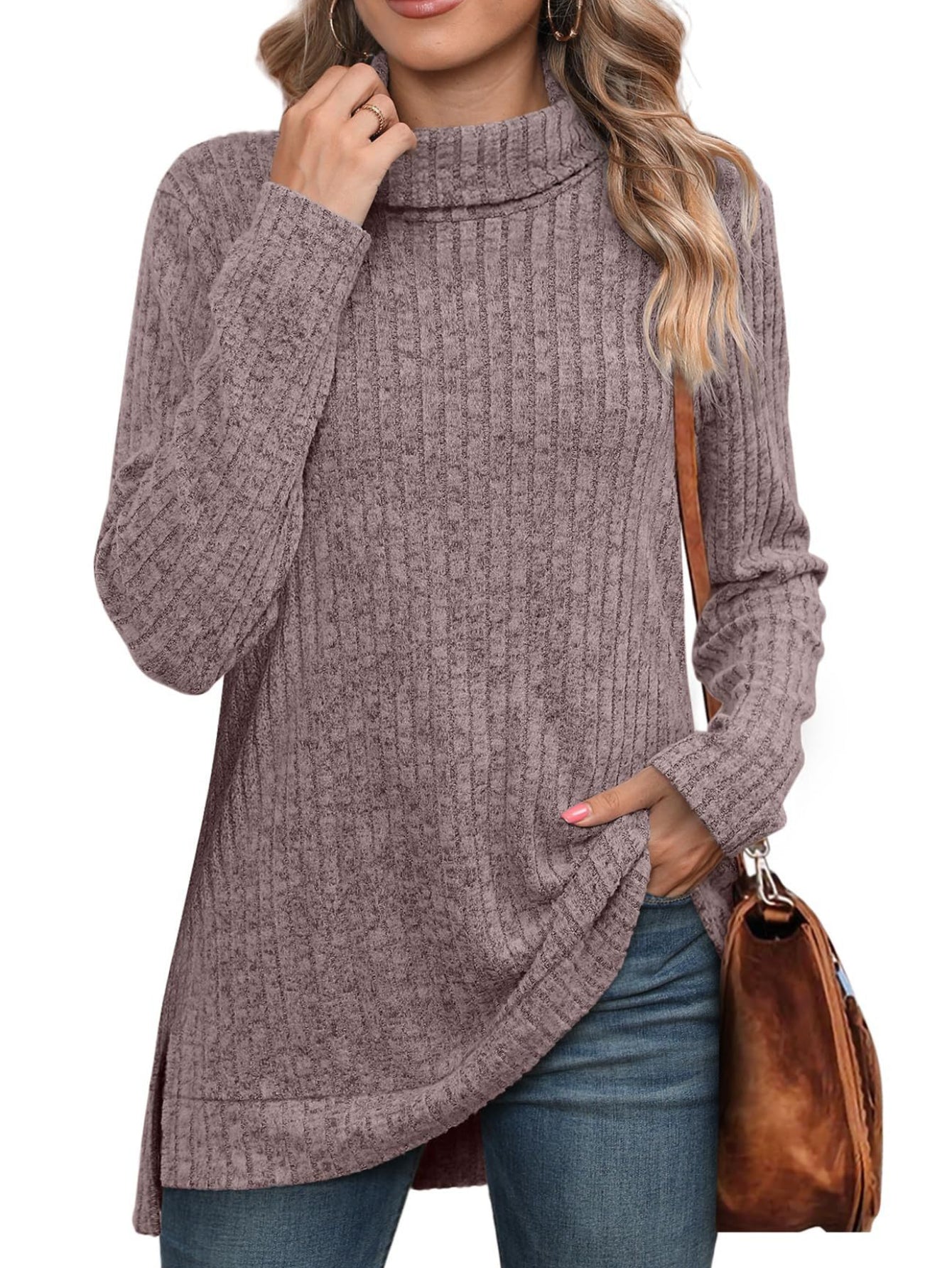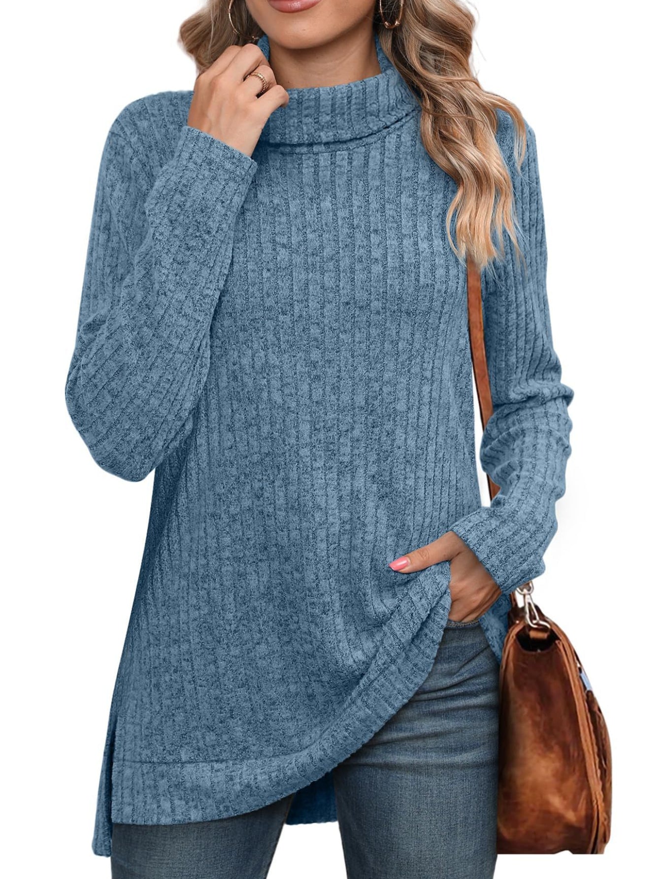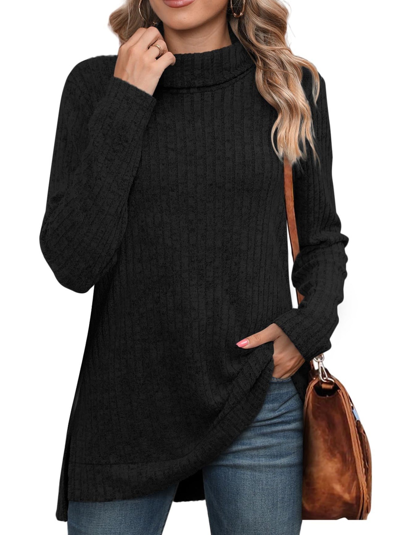 Sale Ribbed Crew Neck Side Split T-Shirt, Casual Long Sleeve Top