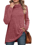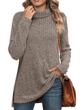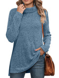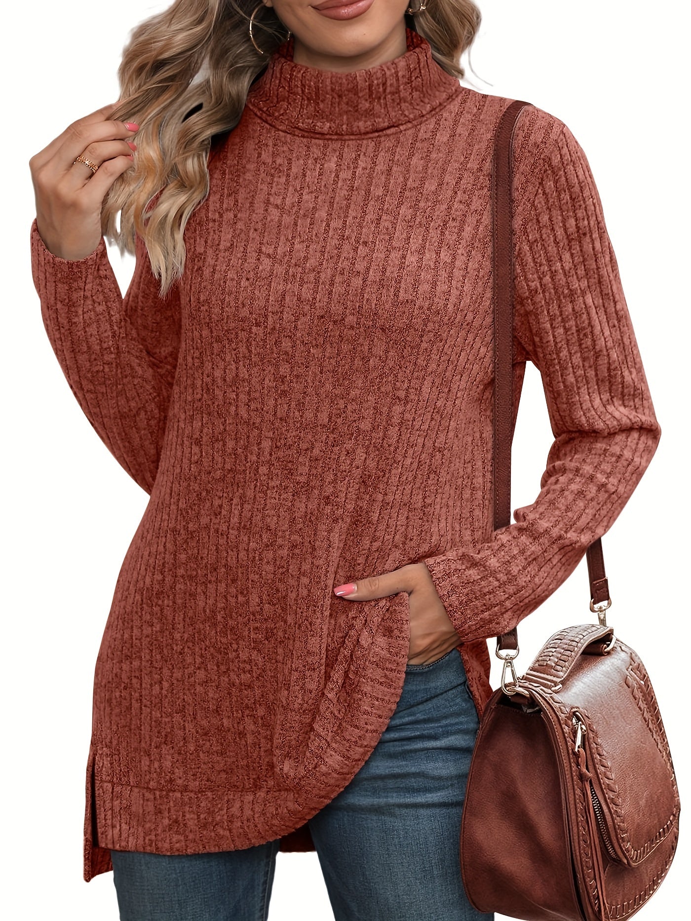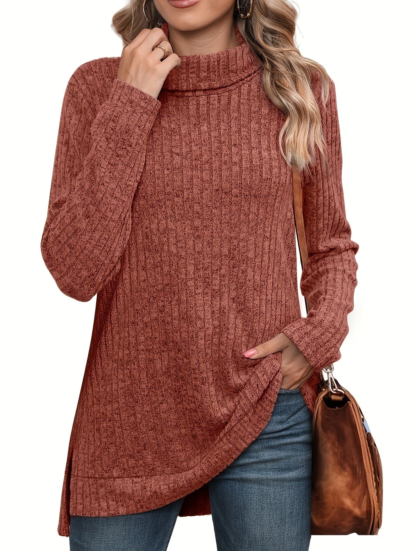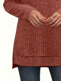Ribbed Crew Neck Side Split T-Shirt, Casual Long Sleeve Top
