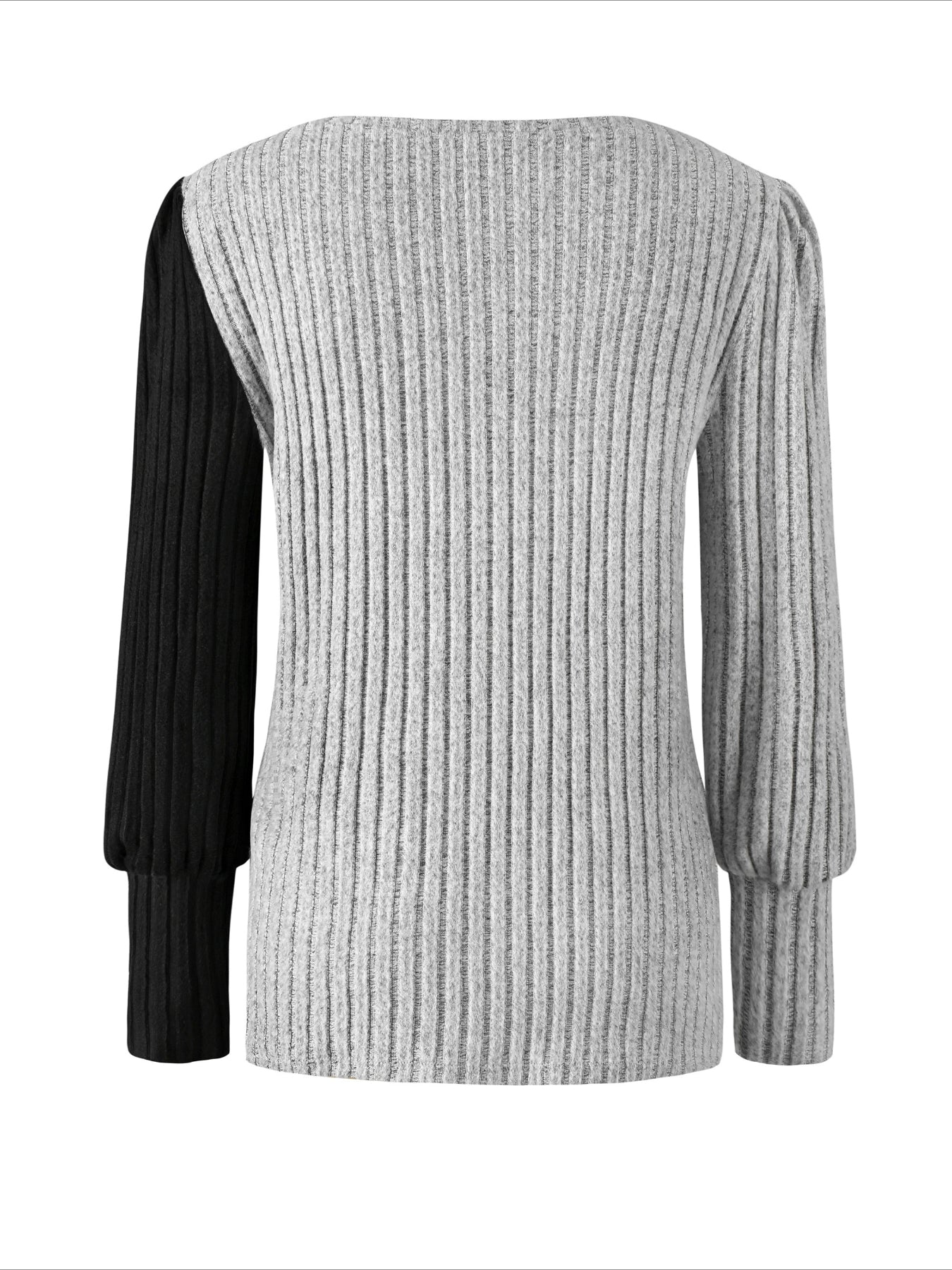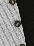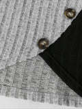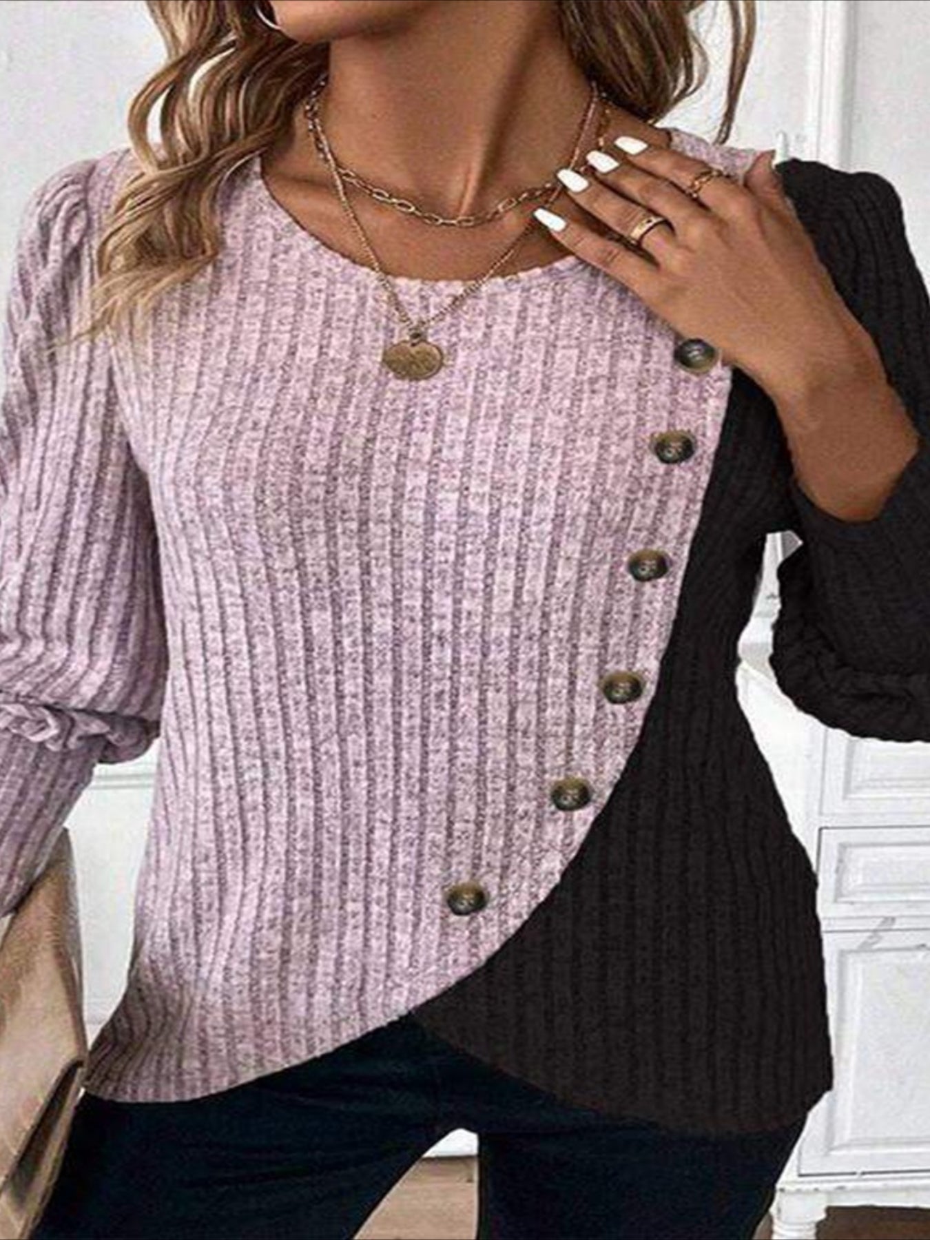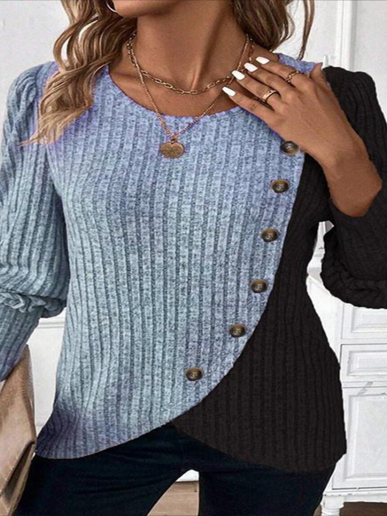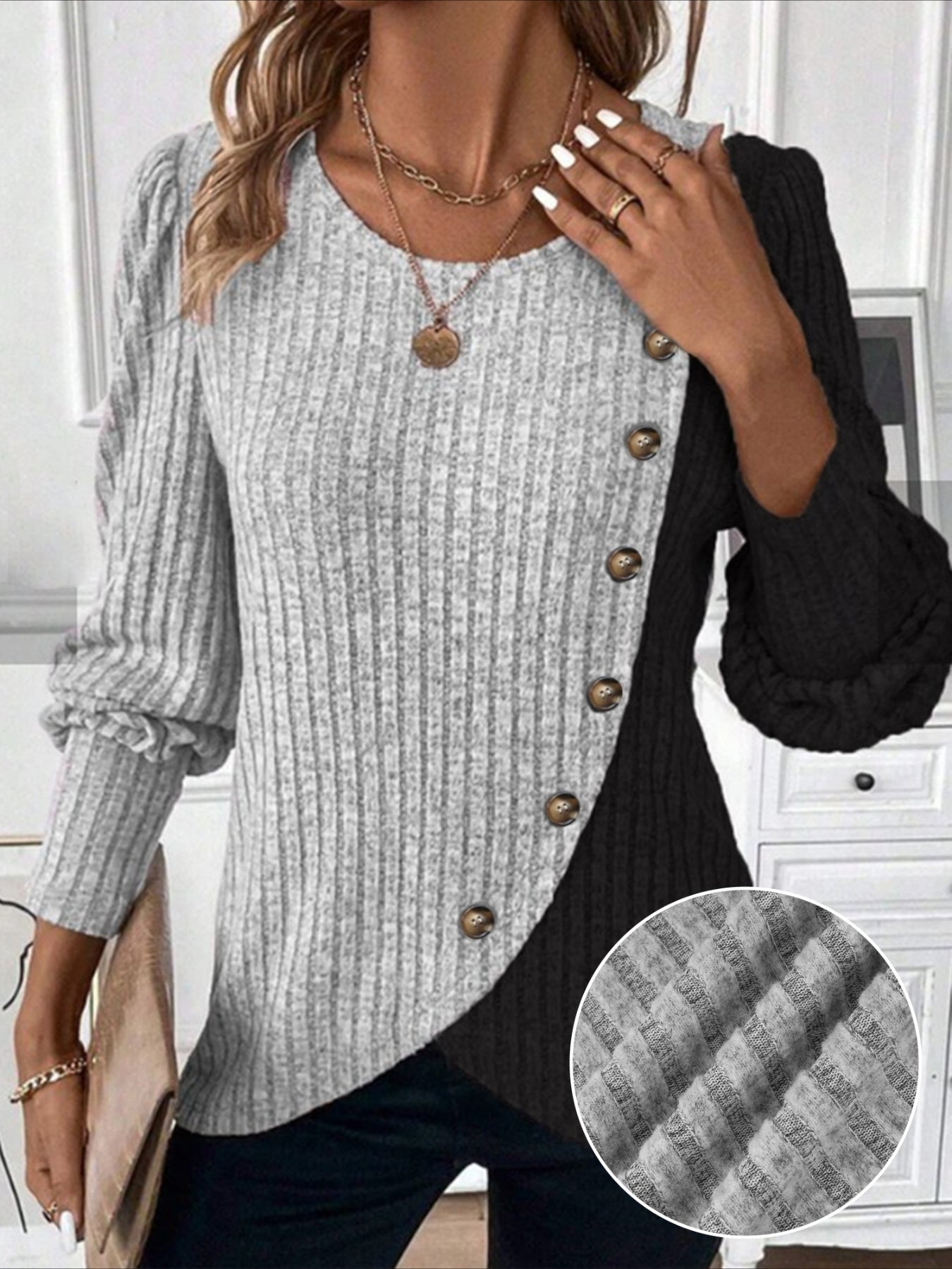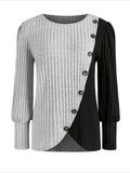 Sale Ribbed Crew Neck T-shirt, Elegant Long Sleeve Buton Decor Top