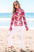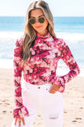 Sale Rose Floral Mesh Flounce Sleeve Mock Neck Blouse