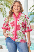 - This plus blouse is sweet and charming with blooming flower print.The frilled neckline and ruffled puff short sleeve add extra feminine charm.This blouse top is lightweight and comfy.It pairs well with jeans, solid pants and skirts for women.