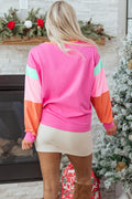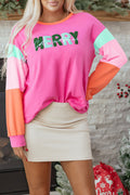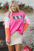 Rose Red Chenille MERRY Christmas Patched Colorblock Long Sleeve Top