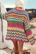 Rose Red Colorblock Striped Hollowed Knit Loose Sleeve Sweater