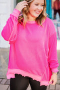 Sale Pink Colorblock Patchwork Long Sleeve Plus Size Top