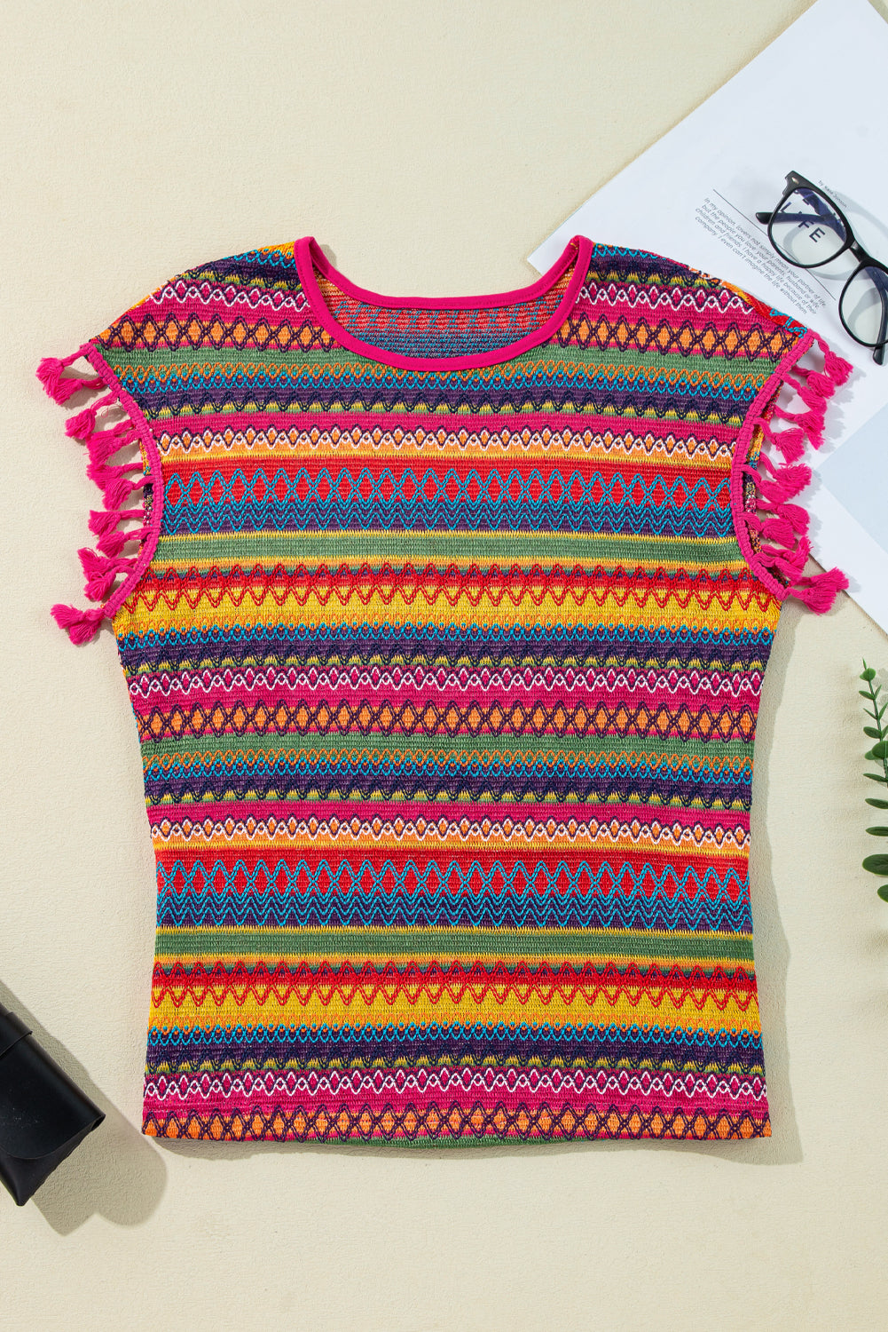 Rose Red Jacquard Textured Tasseled Cap Sleeve Top