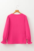 Rose Red Solid Color Shirred Cuff Notch V Neck Blouse