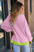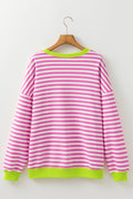 Rose Red Striped Contrast Ribbed Trim Crossed Stitch Drop Shoulder Sweatshirt
