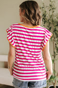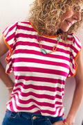Rose Red Striped Ruffle Sleeve Crew Neck Blouse