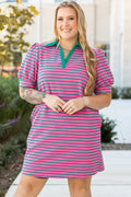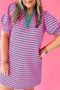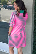 Sale Rose Stripe Collared V Neck Puff Sleeve Shift T Shirt Dress with Pockets