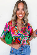 - Stay cool and chic in this breezy lace-up V-neck blouse.Embrace the summer vibes with a vibrant plant print design.Short sleeves for a relaxed and comfortable fit.Versatile piece that can be dressed up or down effortlessly.