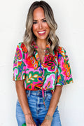 Rose Summer Plant Print Lace up V Neck Short Sleeve Blouse