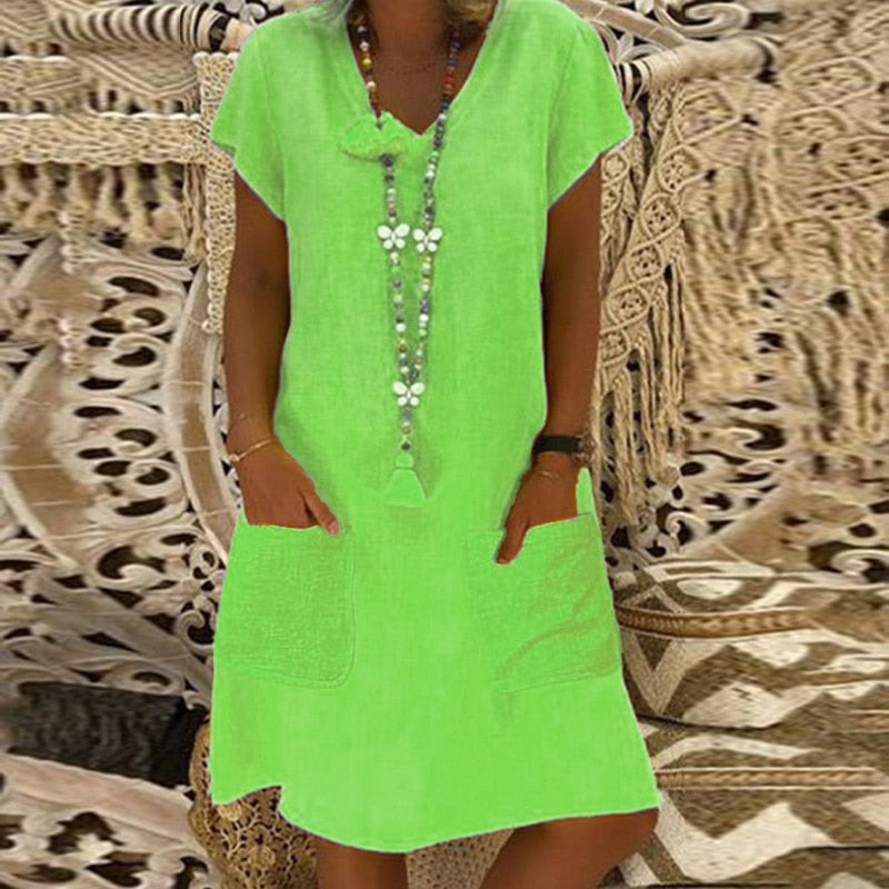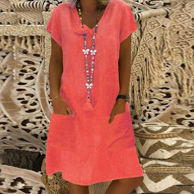 Sale Short Sleeve Solid V Neck Casual Kaftan Pocket Loose Midi Dresses