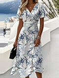Short Sleeve V Neck Printed Waist A-shaped Midi Dress