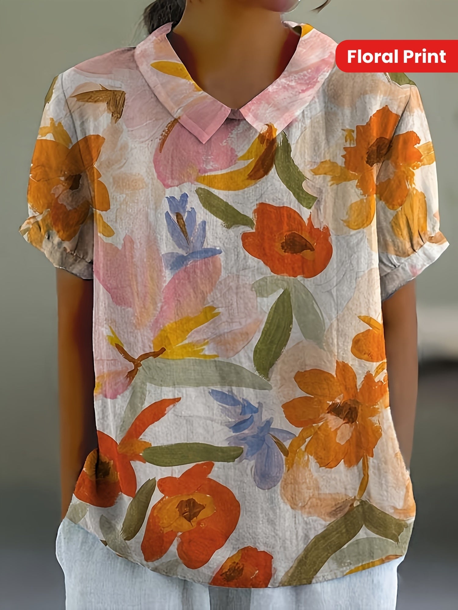 Short Sleeves with Ruffled Detail Non-Sheer Vintage Art Casual Floral Print Shirt