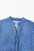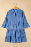 Sky Blue Chambray Ruffled 3/4 Sleeve Tiered Split V Neck Mini Dress
