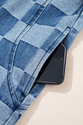 Sky Blue Checkerboard Zipped Neck Kangaroo Pocket Denim Hoodie