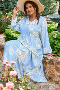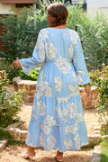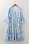 Sky Blue Floral Bracelet Sleeve V Neck Plus Size Tiered Maxi Dress