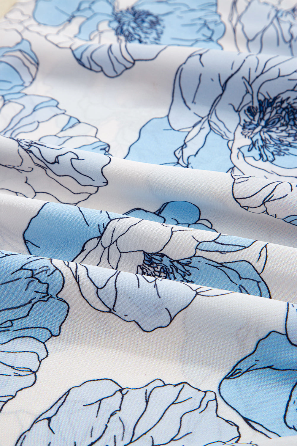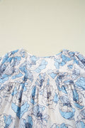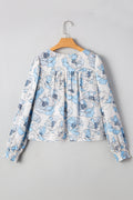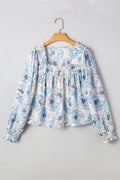 Sale Sky Blue Floral Print Frilly Smocked Square Neck Long Sleeve Blouse