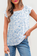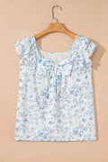 Sky Blue Floral Ruffled Short Sleeve Bow Back Square Neck Blouse