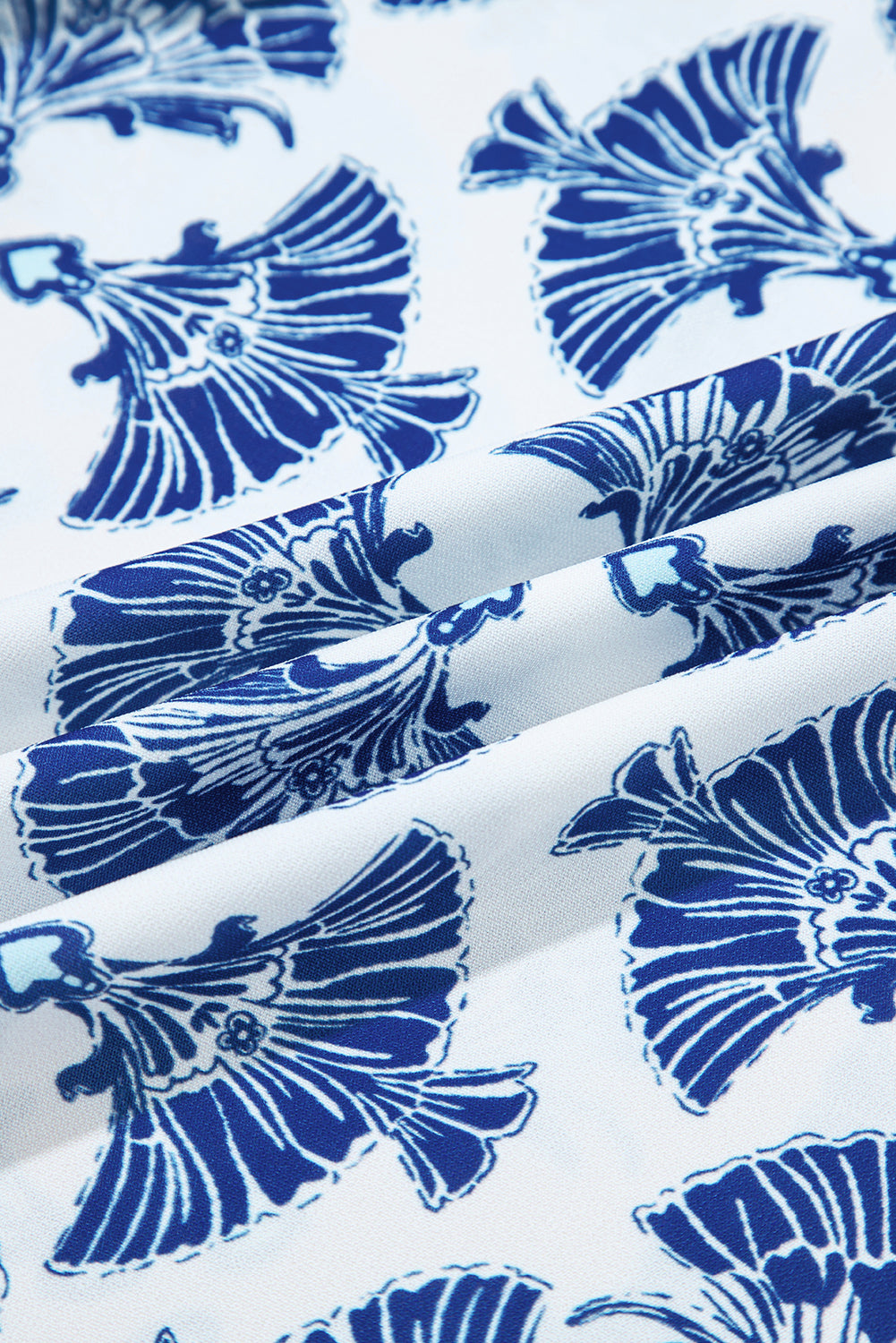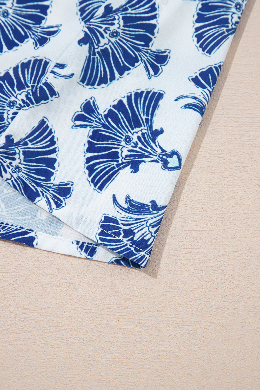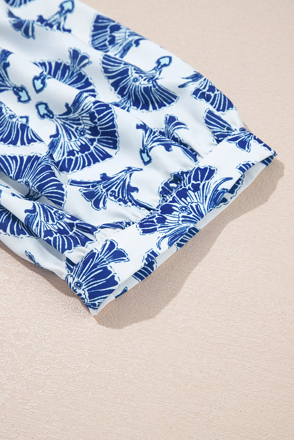 Sale Blue Floral Collared V Neck Roll up Sleeve Shift Blouse