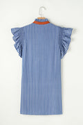 Sky Blue Stripe Frilly Split Neck Shirred Ruffle Sleeve Short Shift Dress