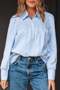 Sky Blue Stripe Shirred Detail Half Placket Collared Long Sleeve Fall Shirt