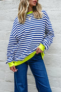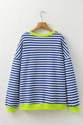 Sky Blue Stripe Striped Contrast Ribbed Trim Crossed Stitch Drop Shoulder Sweatshirt