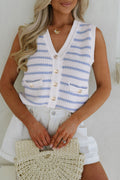 Sky Blue Stripe V Neck Gold Buttons Elegant Sweater Vest