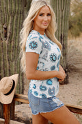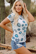 Sale Sky Blue Western Turquoise Printed Crewneck Slim Fit Tee