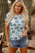 - Authentic western flair with vibrant turquoise print.Crafted with a slim fit design for a modern look.Versatile crew neck style suitable for various occasions.This print tee is soft and comfy with fine quality.