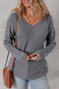 - Stylish chevron texture adds depth and visual interest to this knit top.Flattering V neck design highlights your neckline with a modern touch.Long sleeves patchwork create a mixed textured fabric.The solid color and concise style make it a versatile piece for easy pairing.