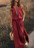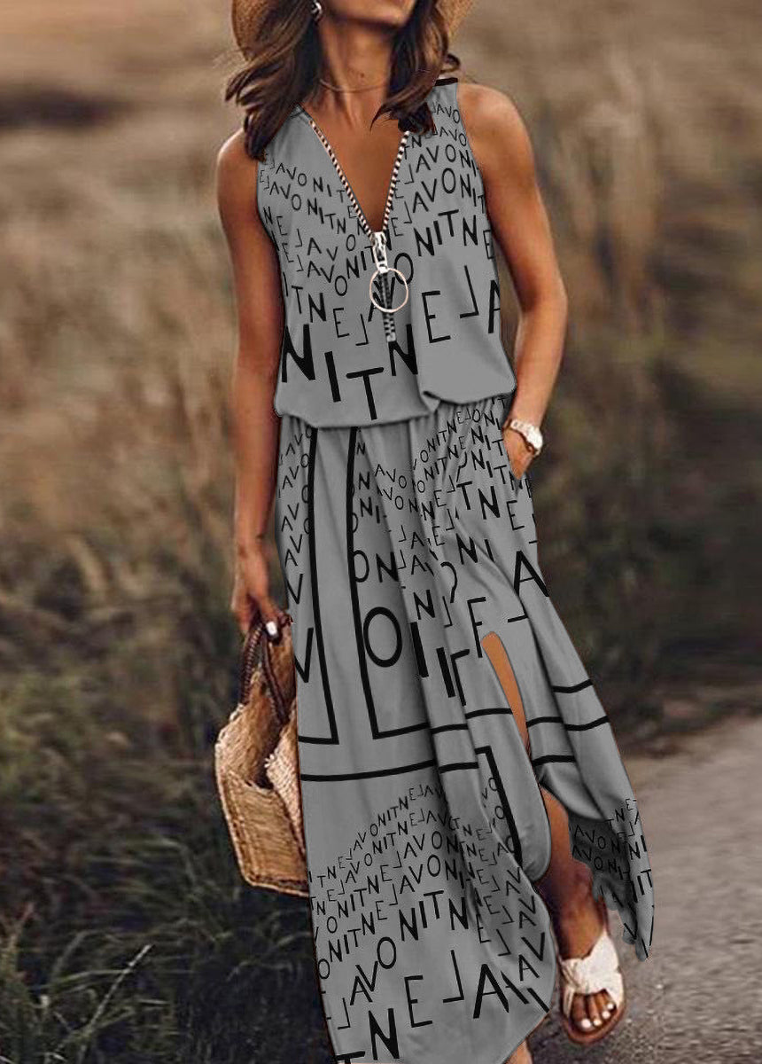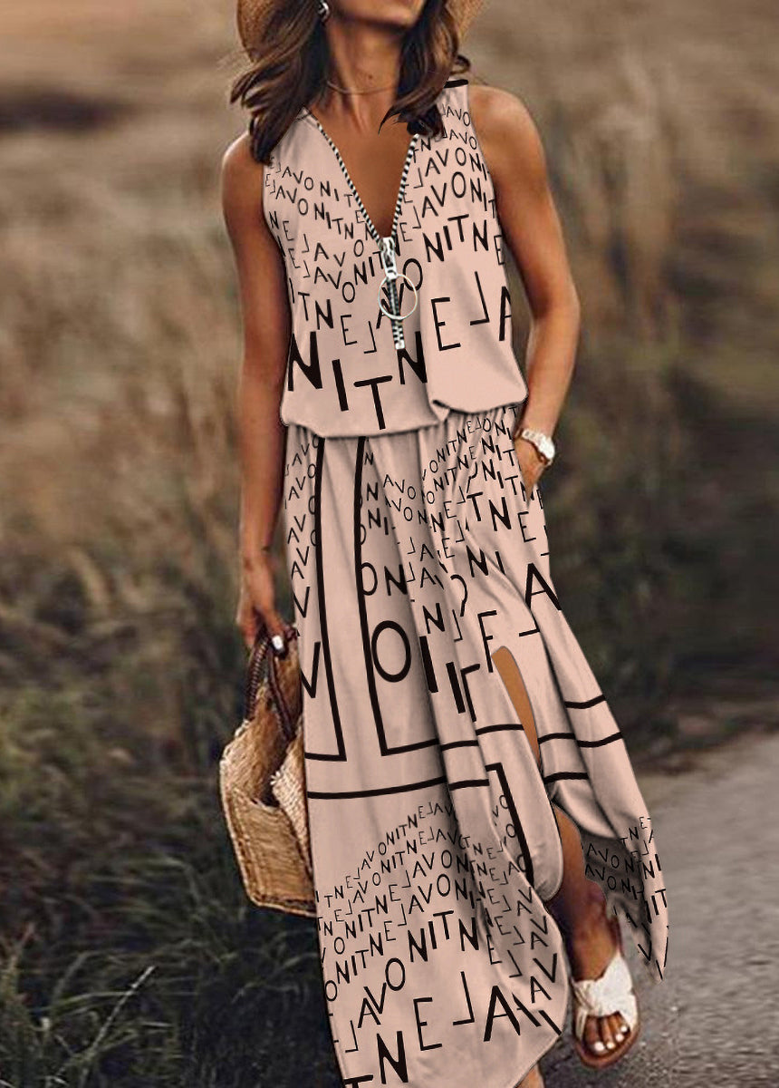 Sleeveless Casual Waist-tie Zipper Letter Print Dress