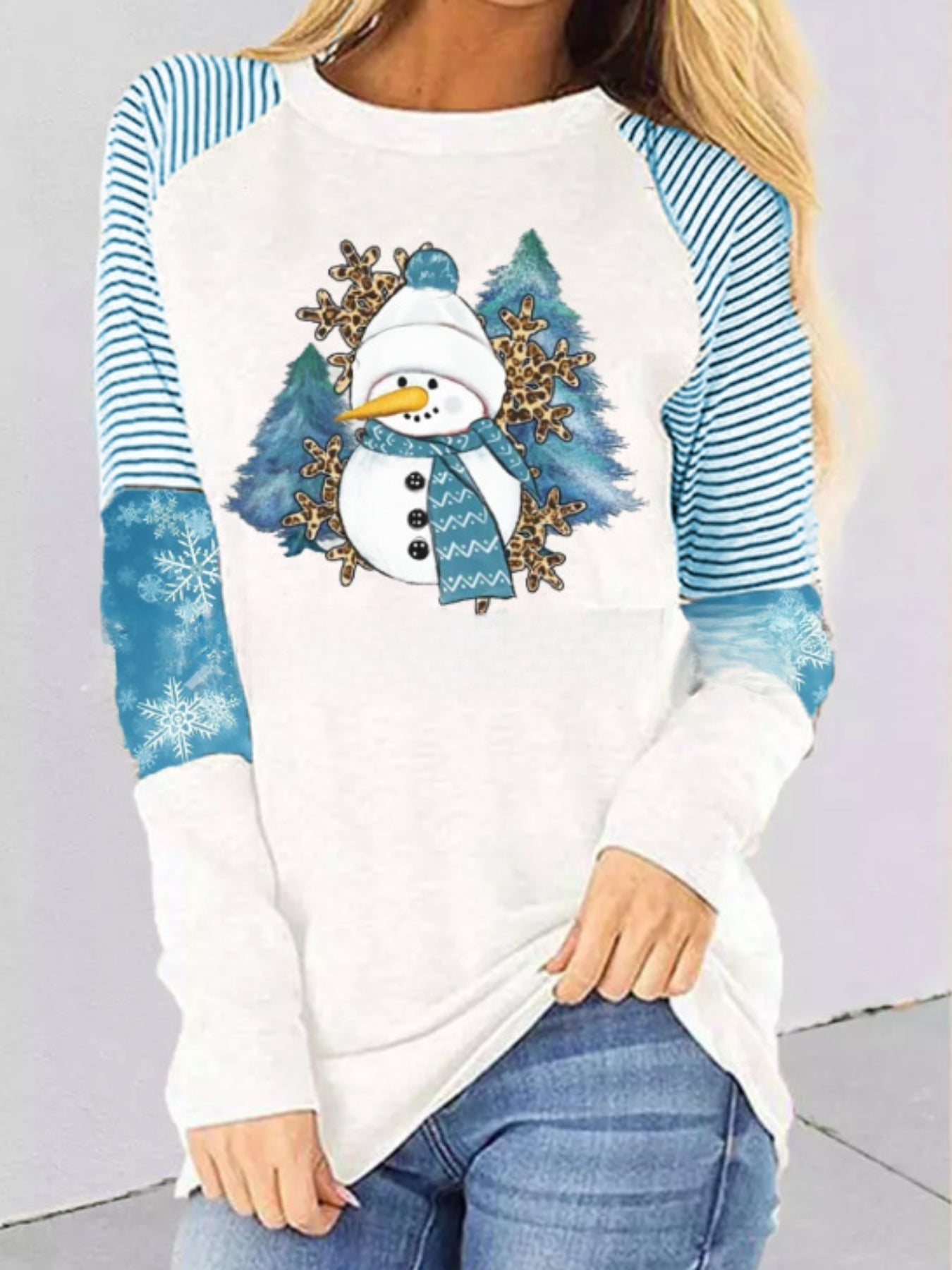 Snowman Pattern Crew Neck T-Shirt, Casual Long Sleeve Top