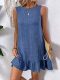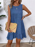 Solid Blue Round Neck Lightweight Sleeveless A-Line Dress with Back Bow Tie Detail