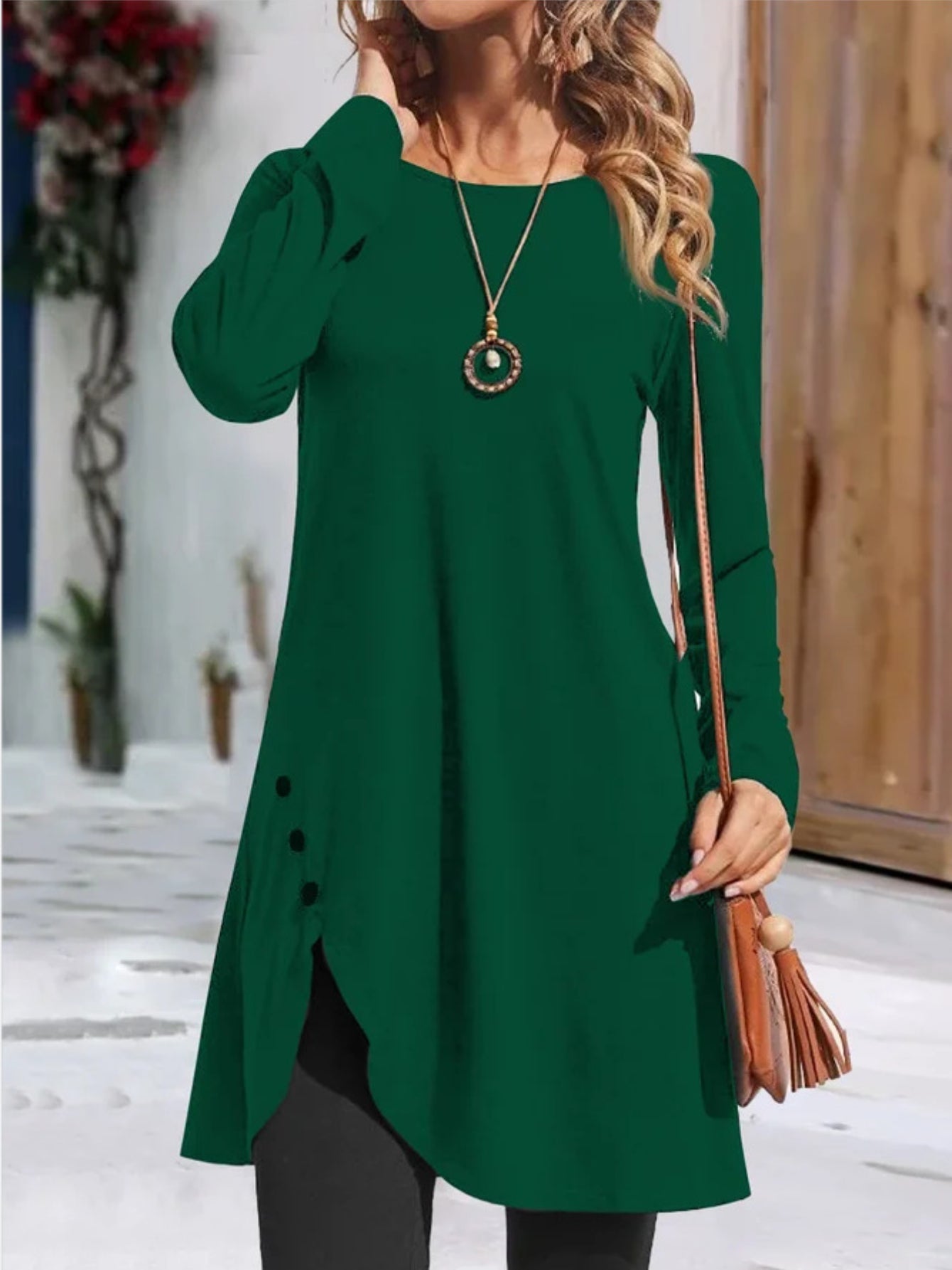 Solid Color Crew Neck, Casual Long Sleeve Asymmetric Hem Dress