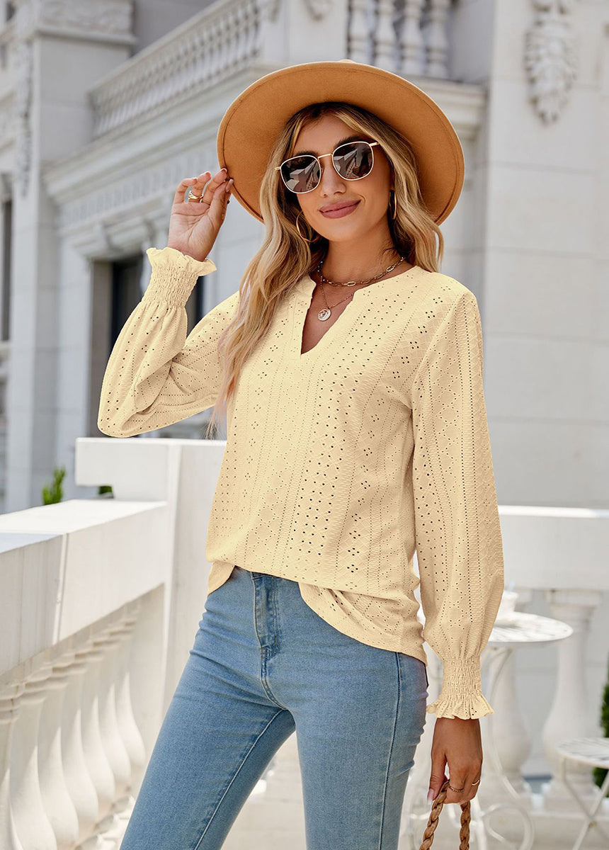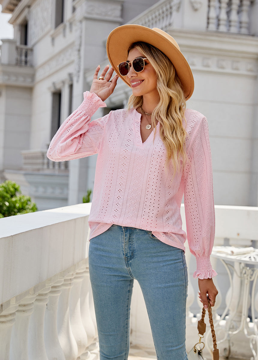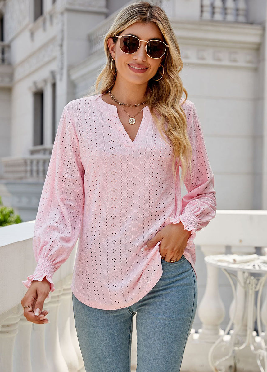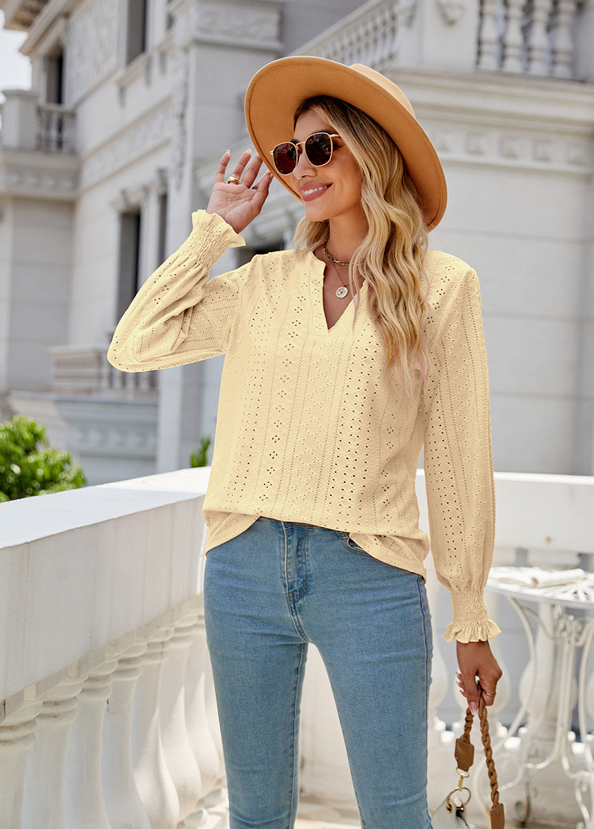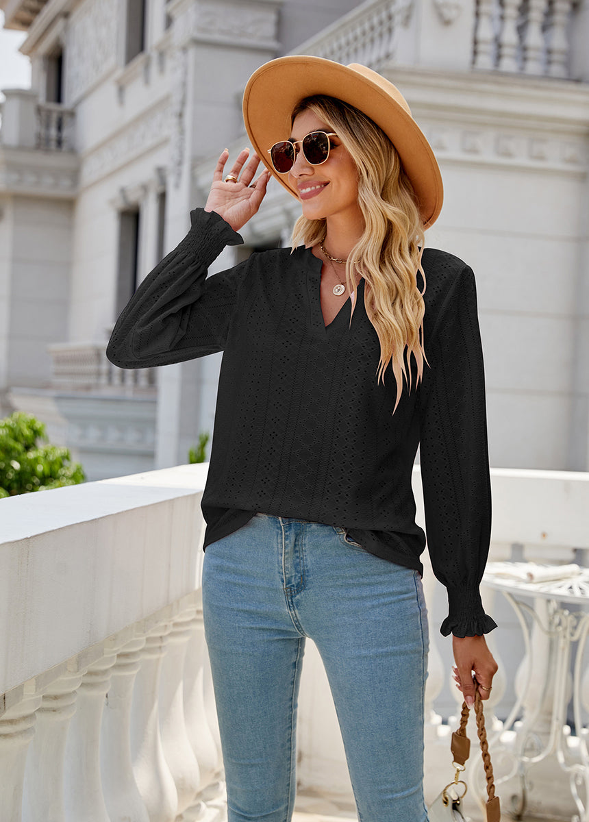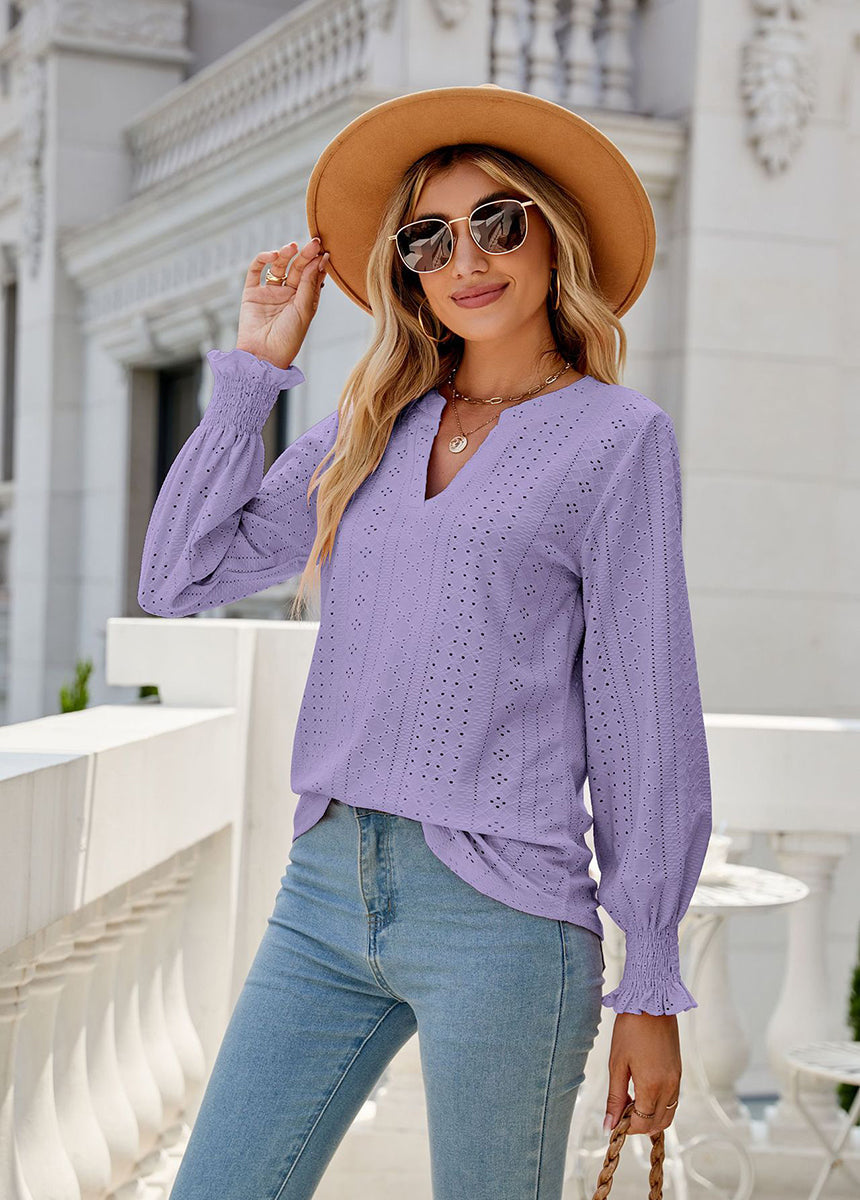 Sale Solid Color Hollow Pleated Ruffle Sleeve V-Neck Loose Long Sleeve Top