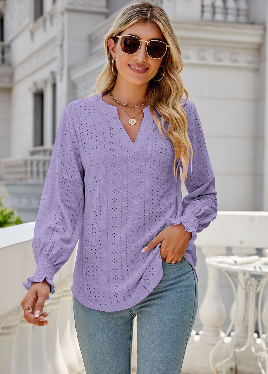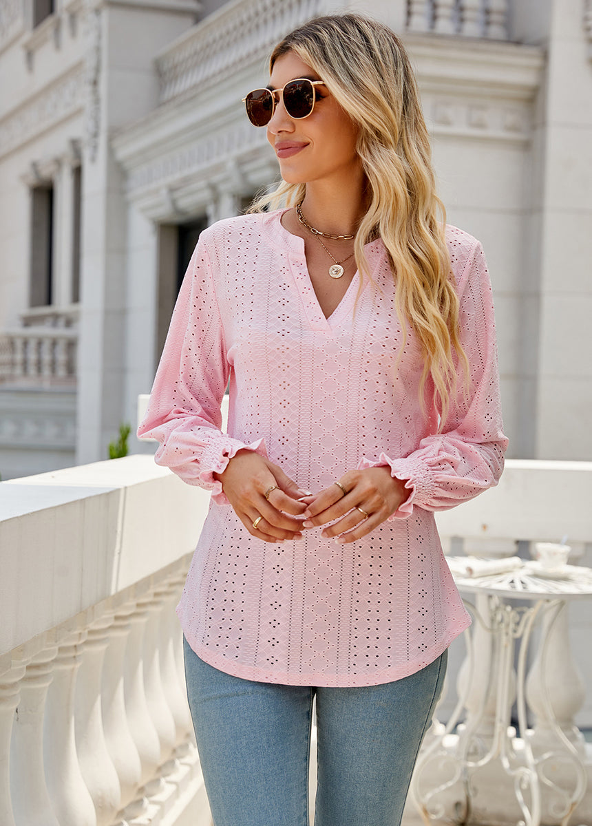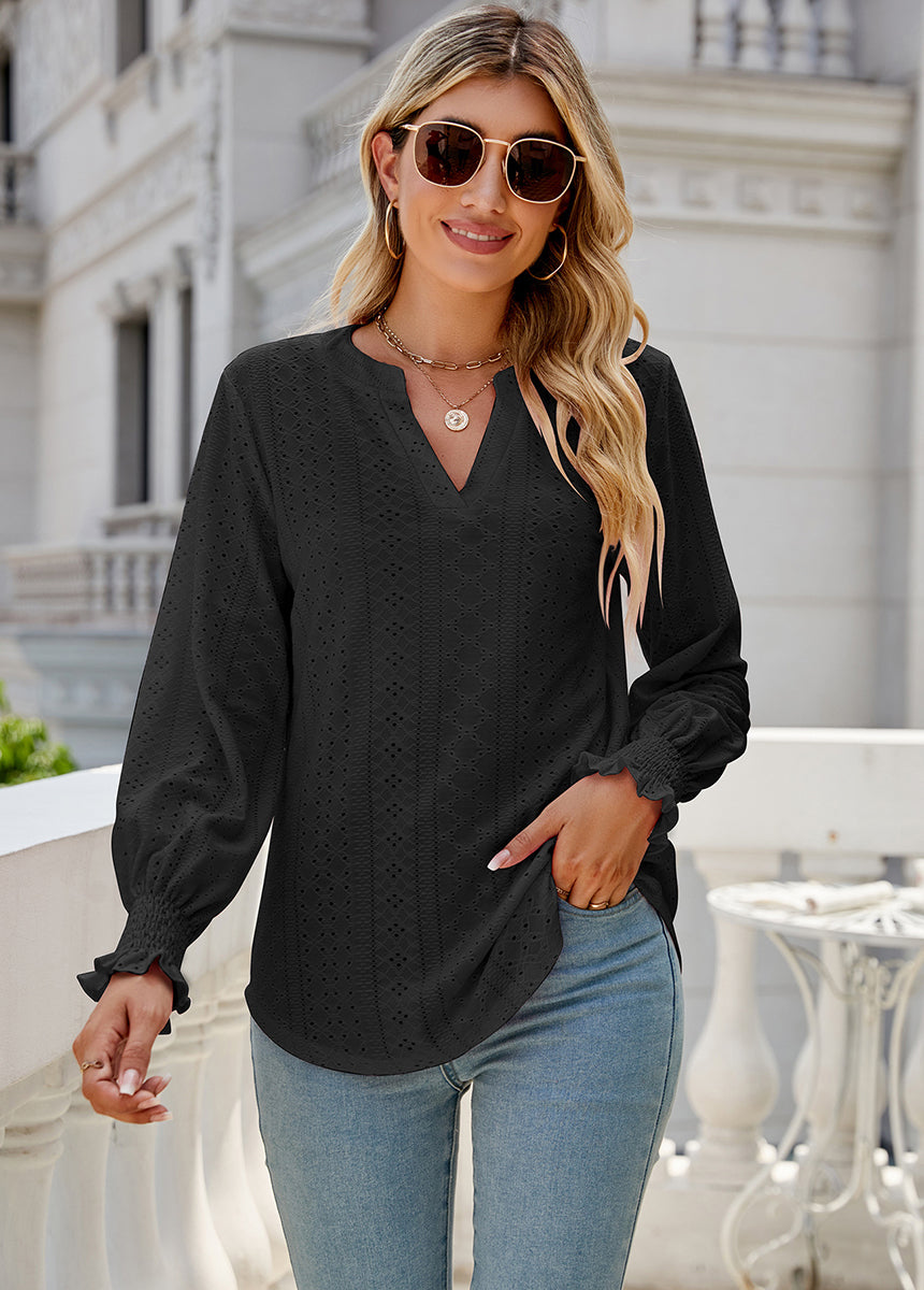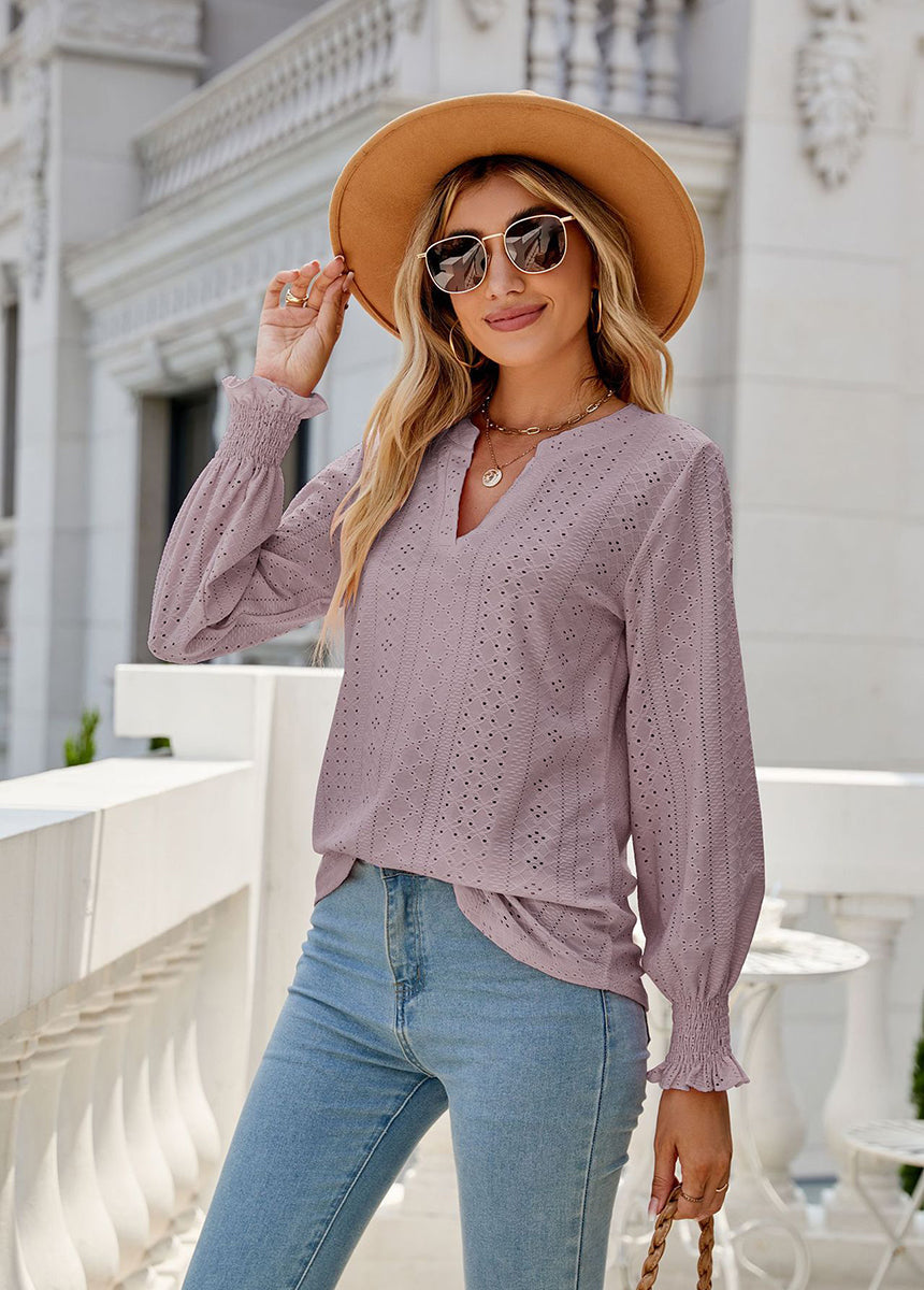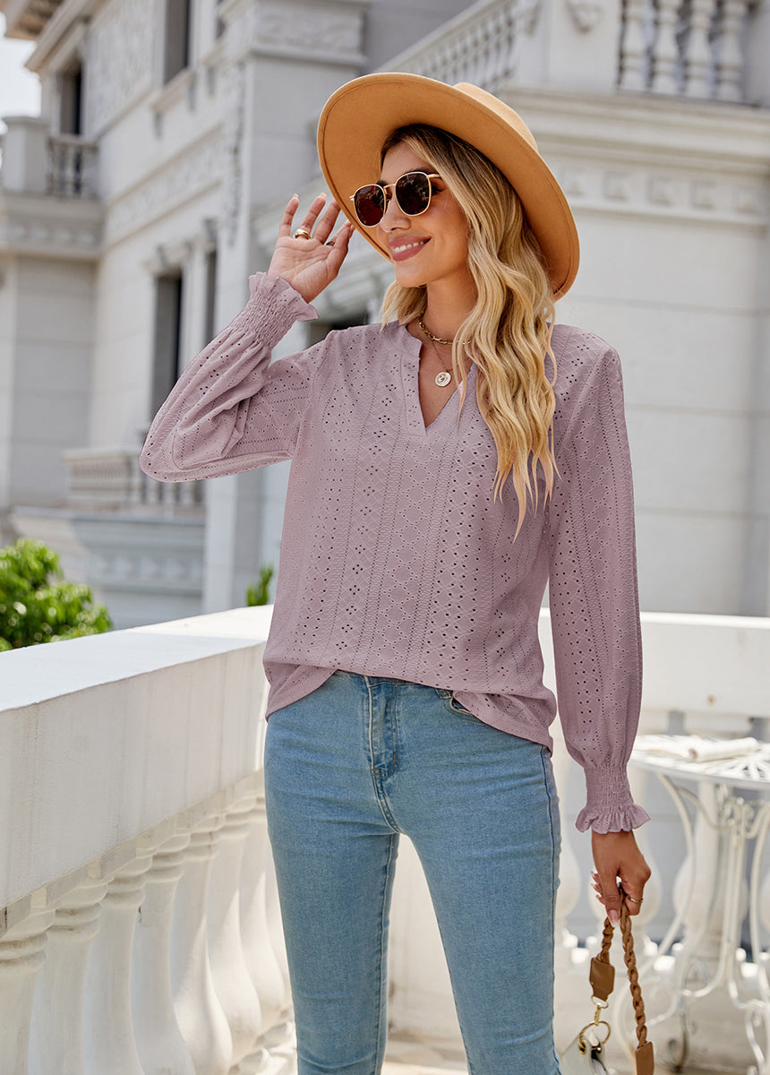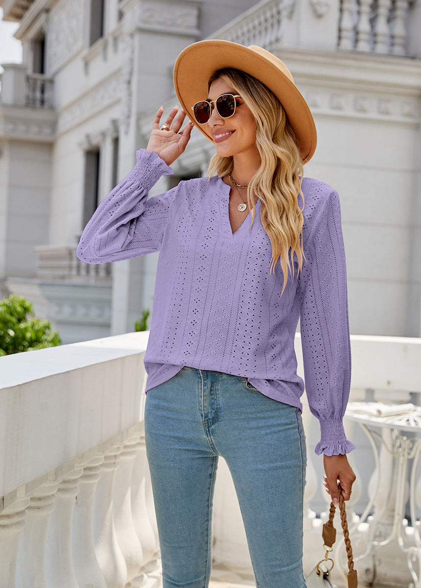 Sale Solid Color Hollow Pleated Ruffle Sleeve V-Neck Loose Long Sleeve Top