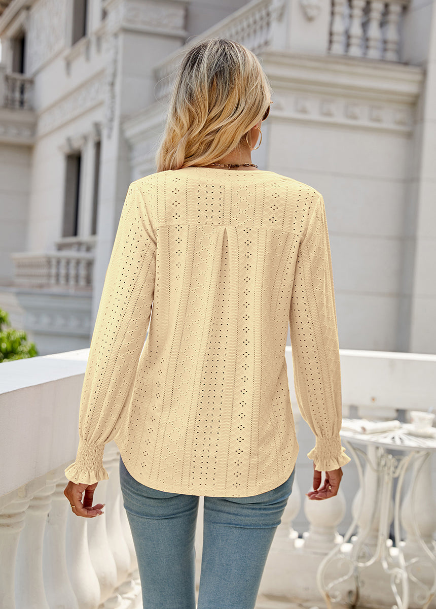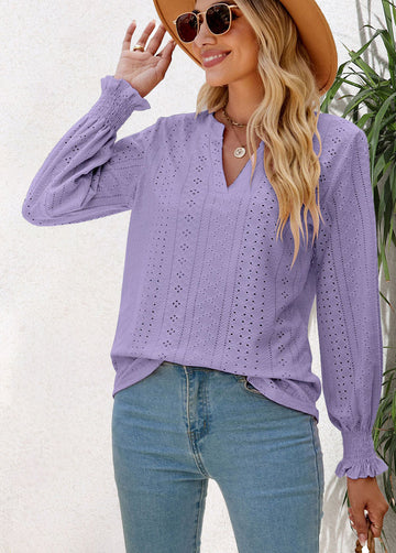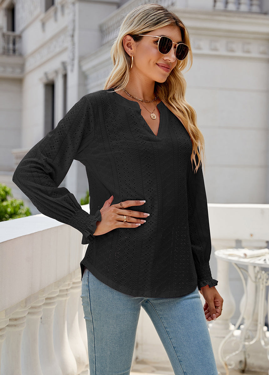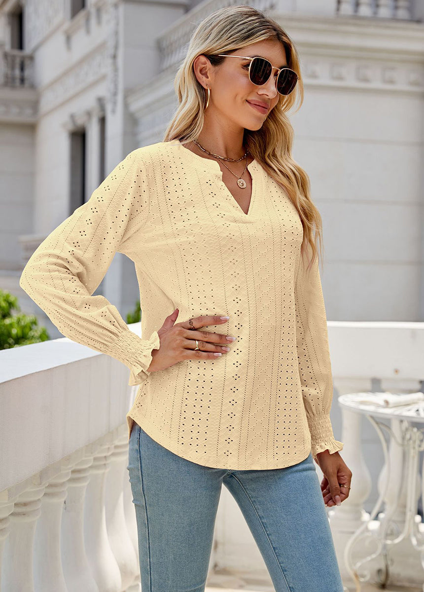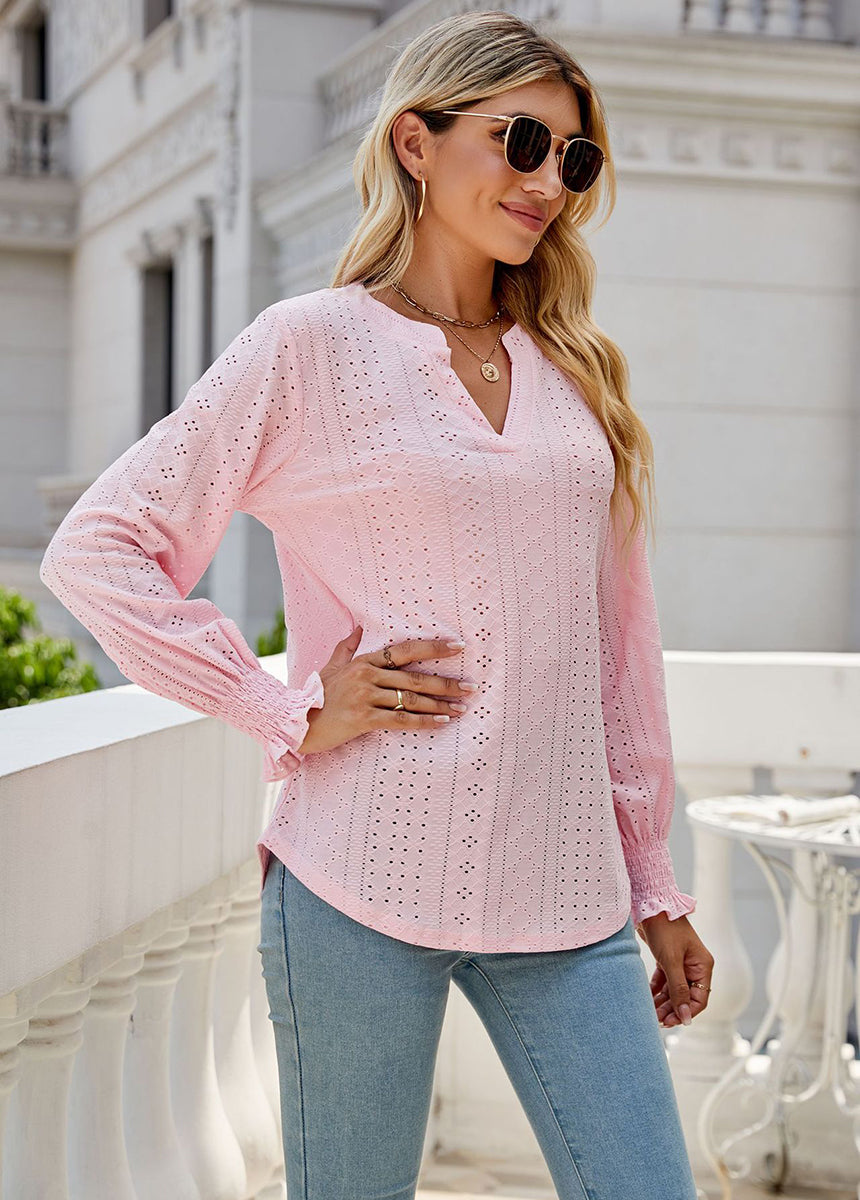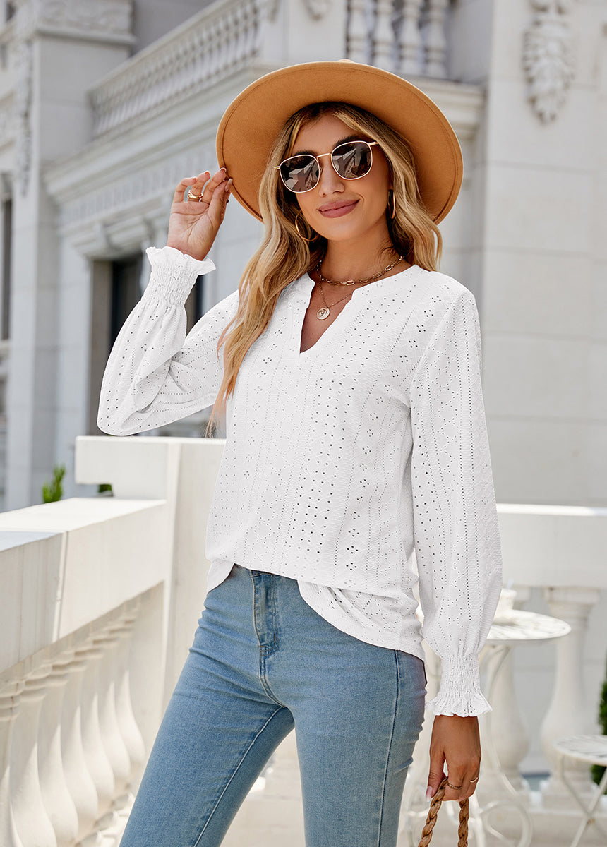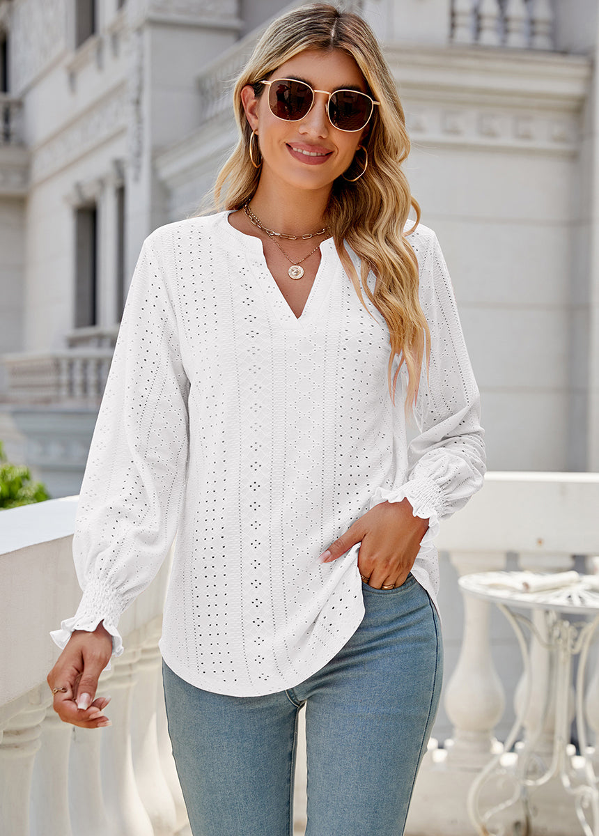 Sale Solid Color Hollow Pleated Ruffle Sleeve V-Neck Loose Long Sleeve Top