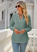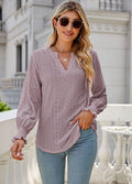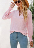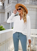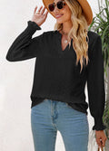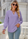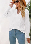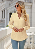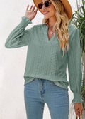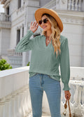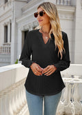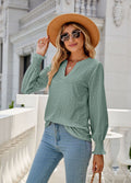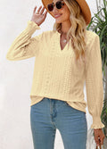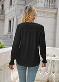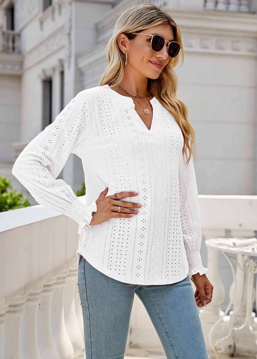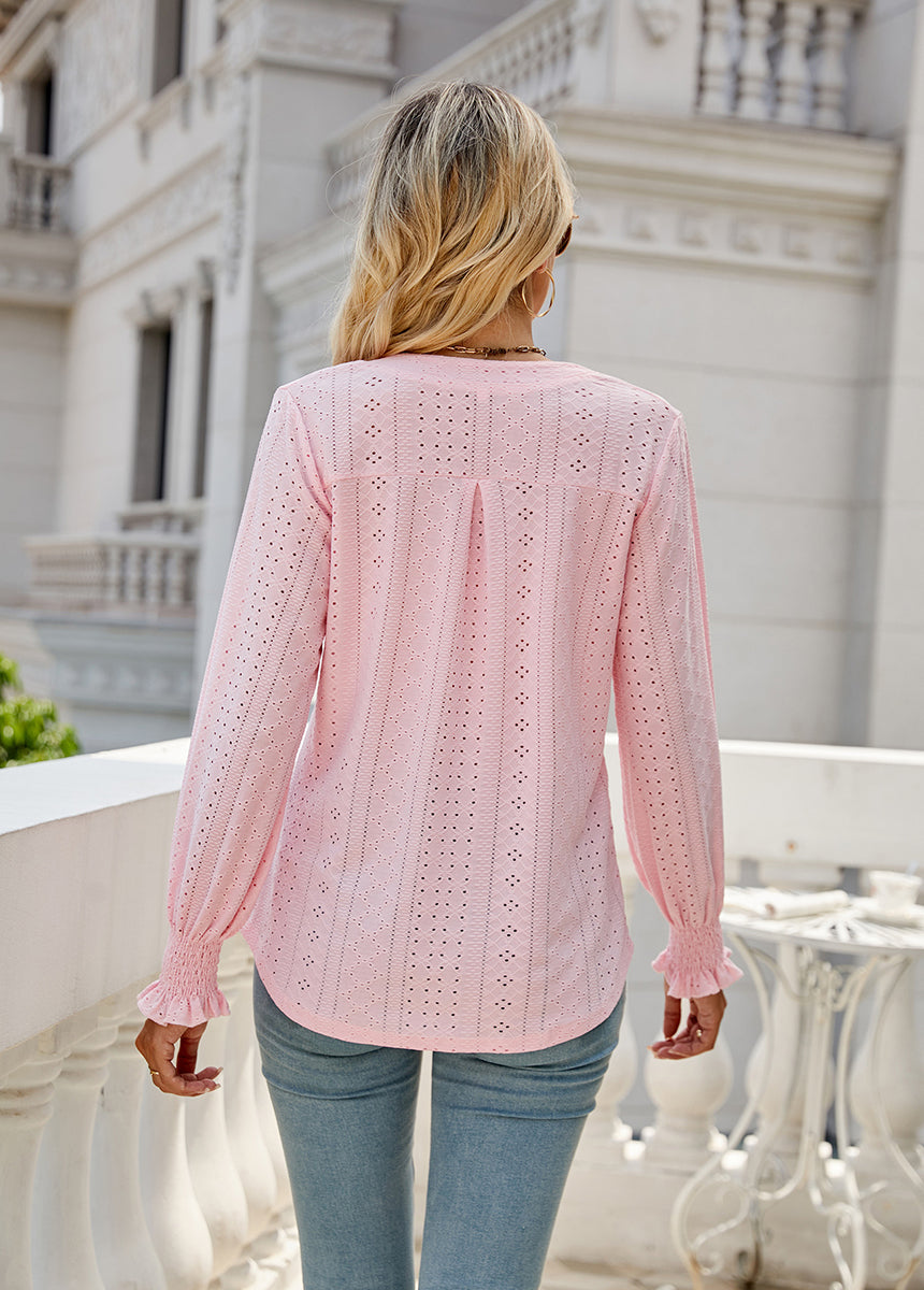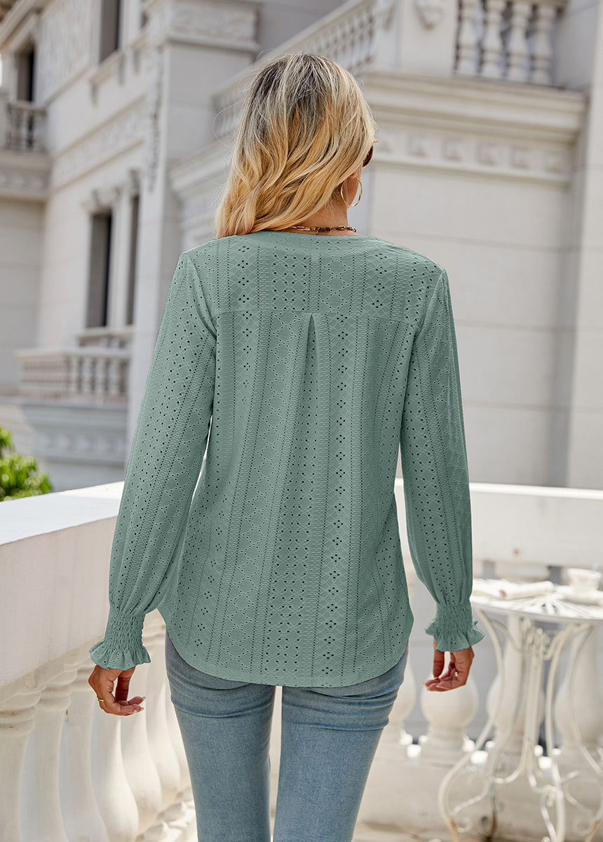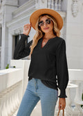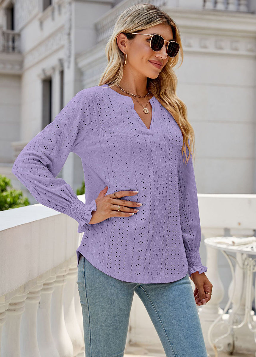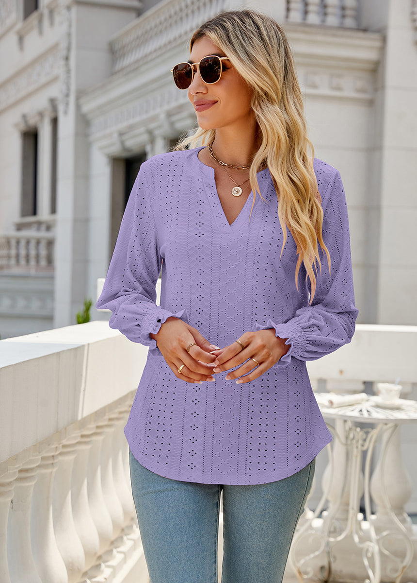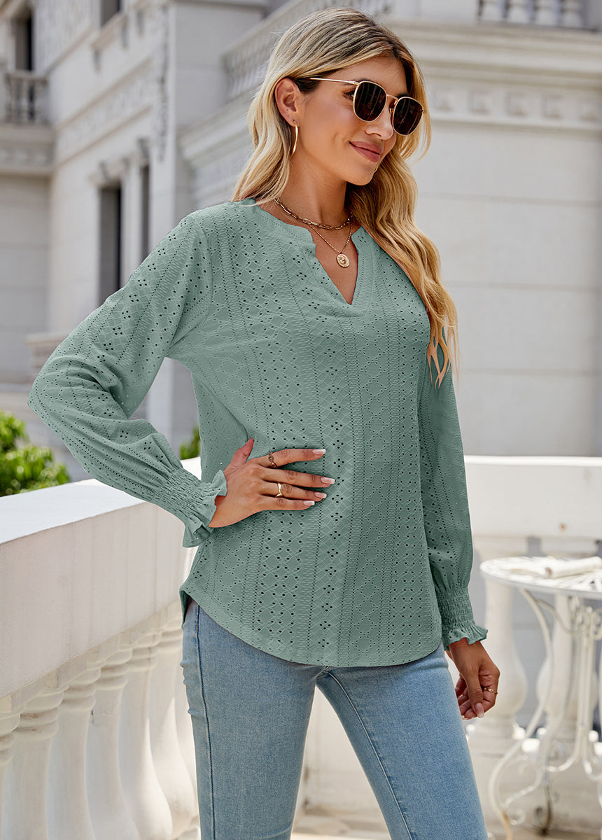 Sale Solid Color Hollow Pleated Ruffle Sleeve V-Neck Loose Long Sleeve Top