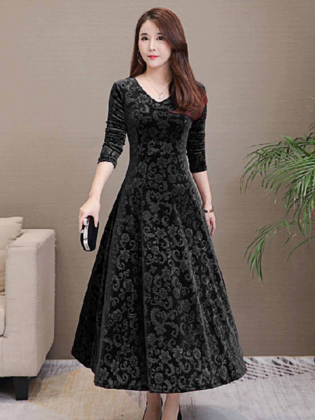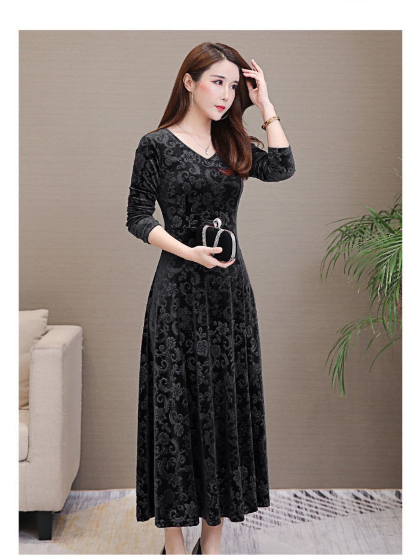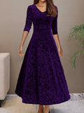 Sale Long Sleeve Vintage Solid Crew Neck Maxi Dress