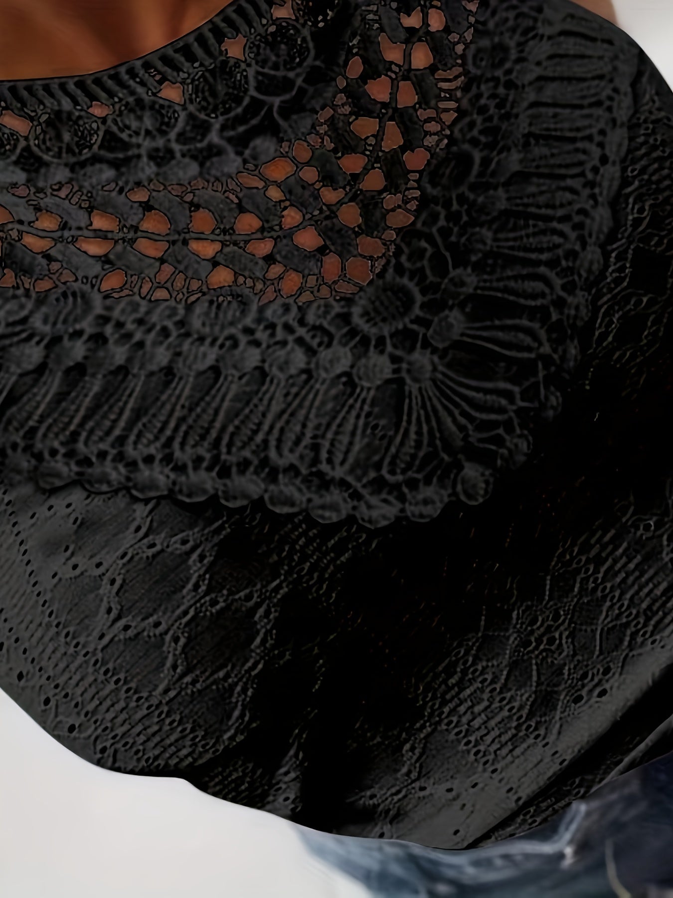 Sale Lace Splicing Swiss Dot V-neck Blouse, Elegant Long Sleeve Blouse Top