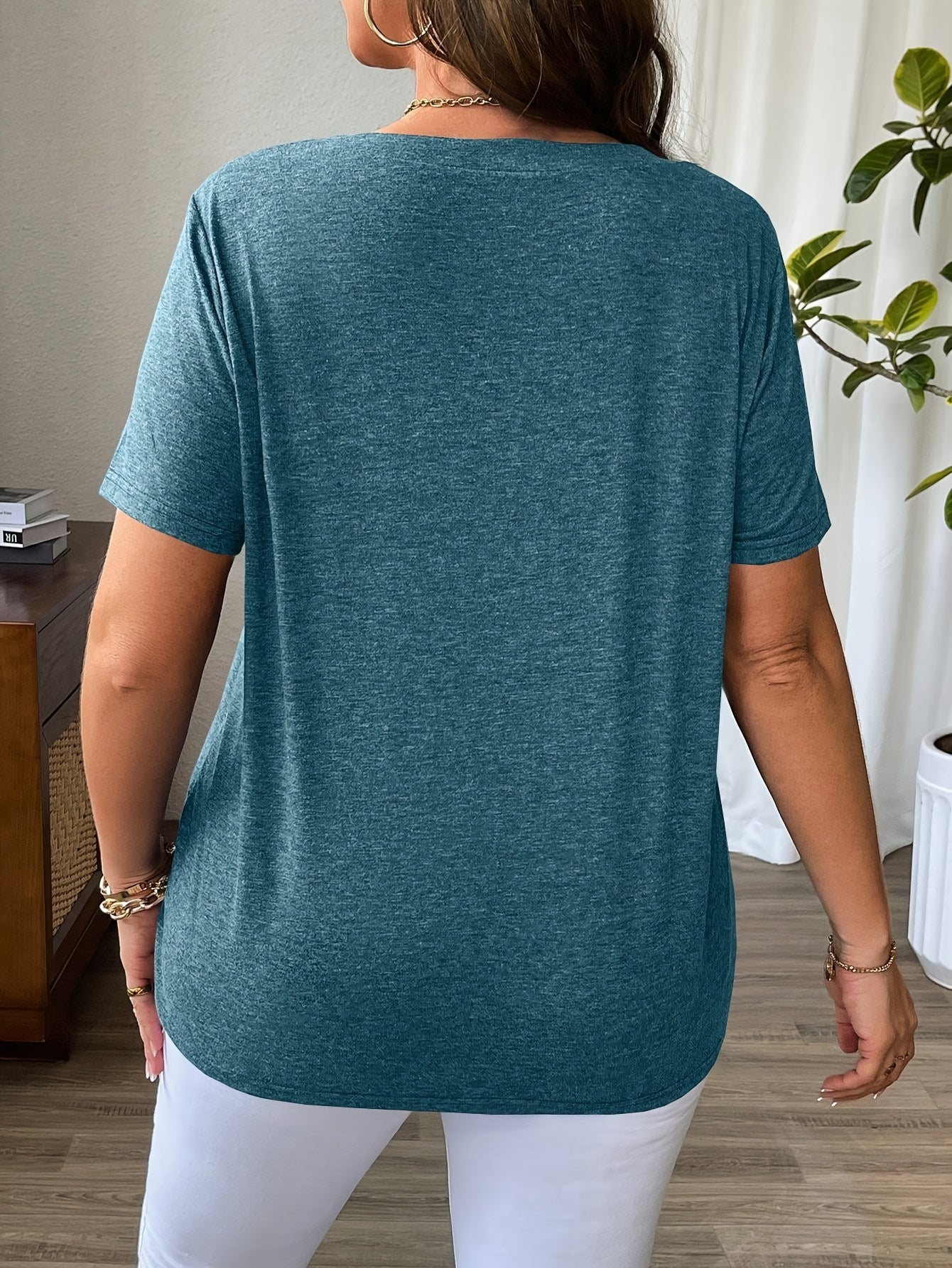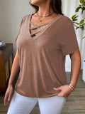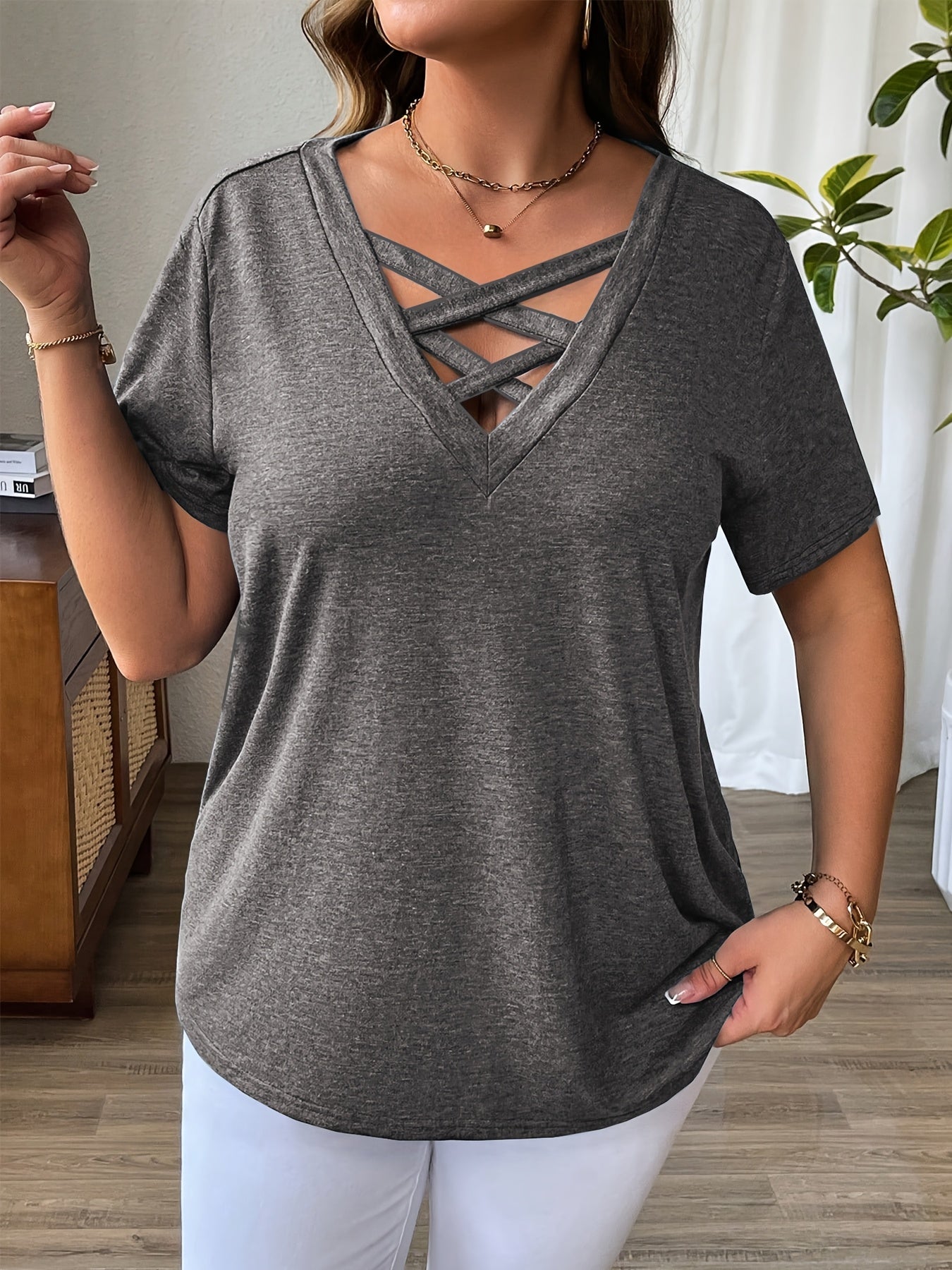 Sale Solid Color T-Shirt with Crisscross V-Neck and Short Sleeves