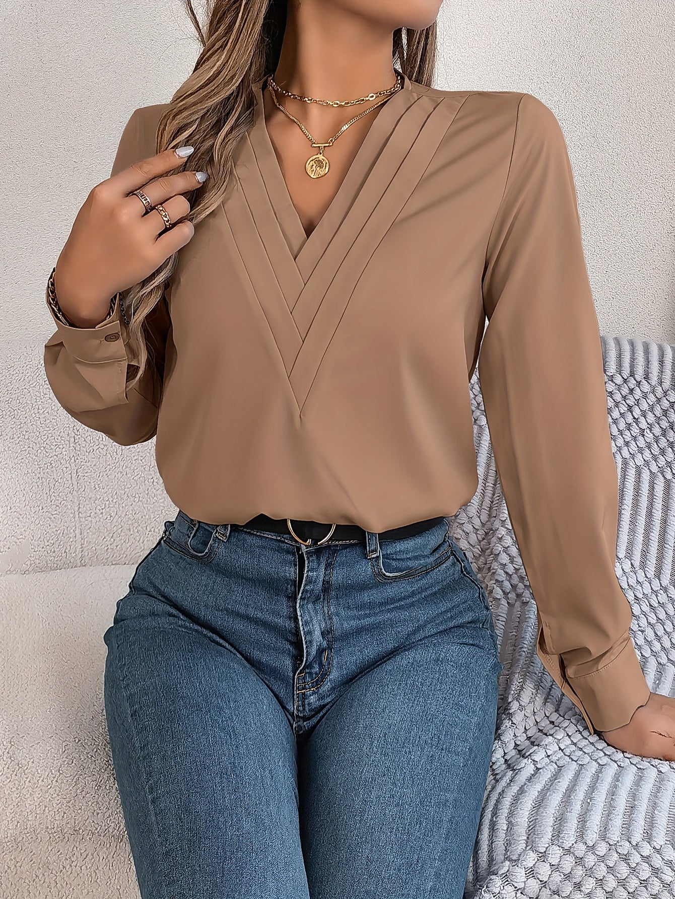 Sale Solid Color V Neck Blouse, Elegant Long Sleeve Blouse
