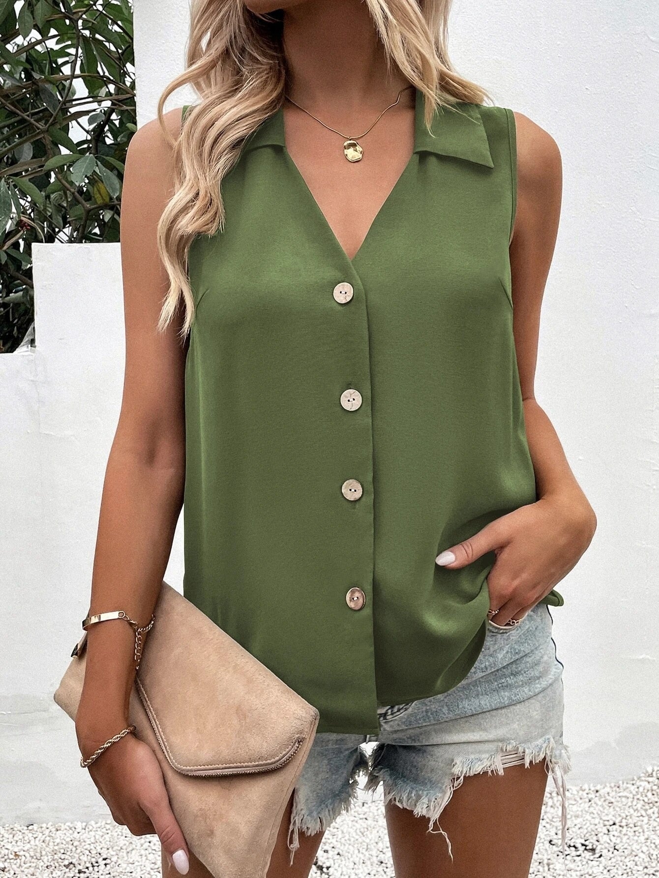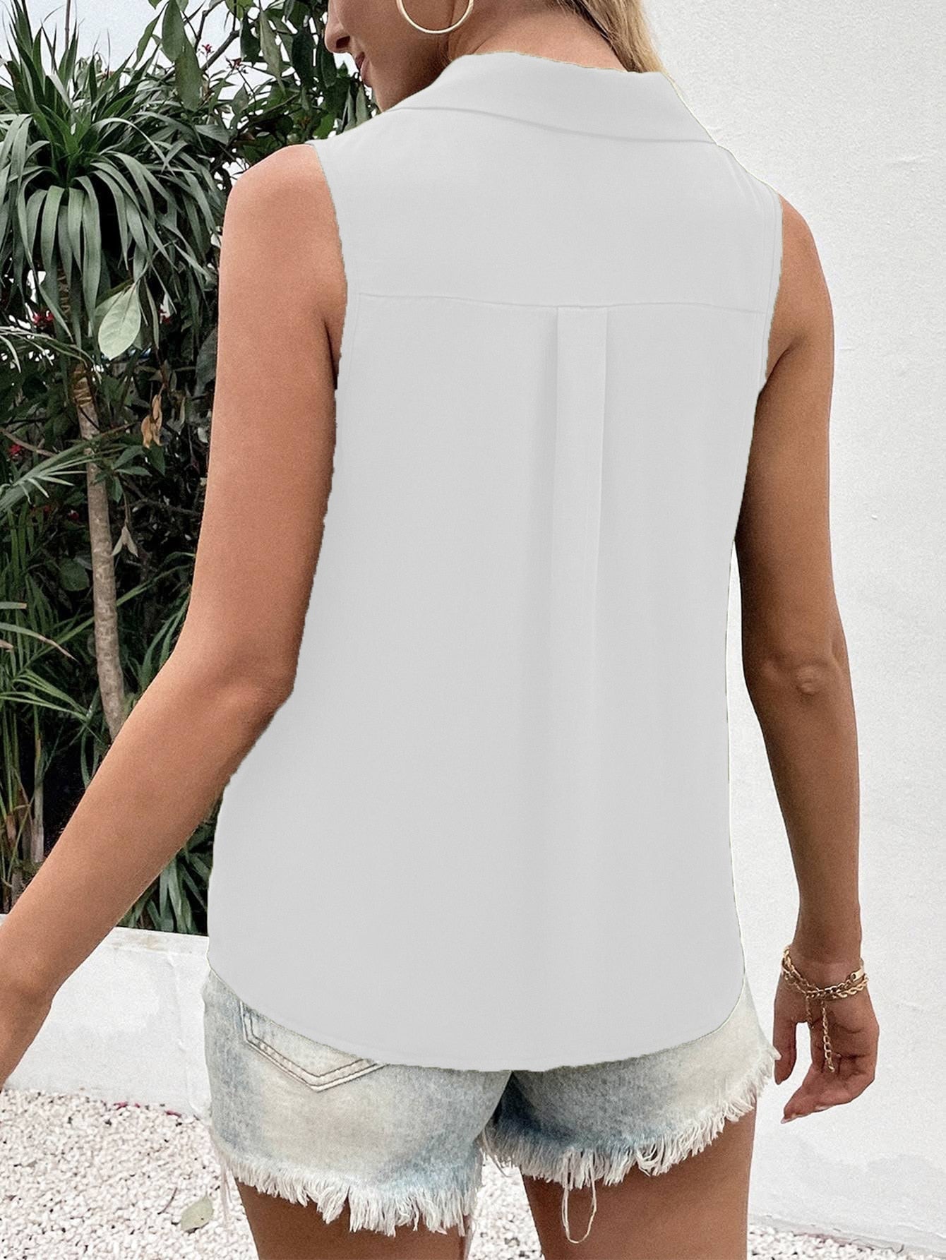 Sale Solid Color V-Neck Sleeveless Button Tank Tops