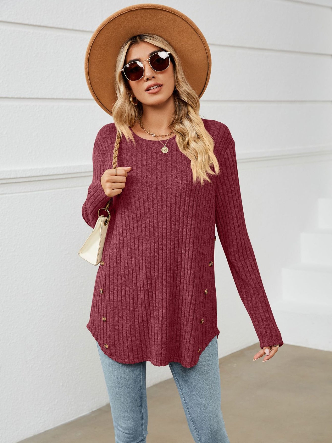 Solid Crew Neck Rib Knit Top, Casual Button Long Sleeve Loose Sweater