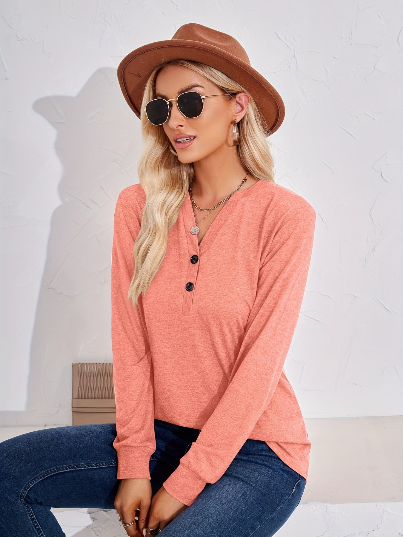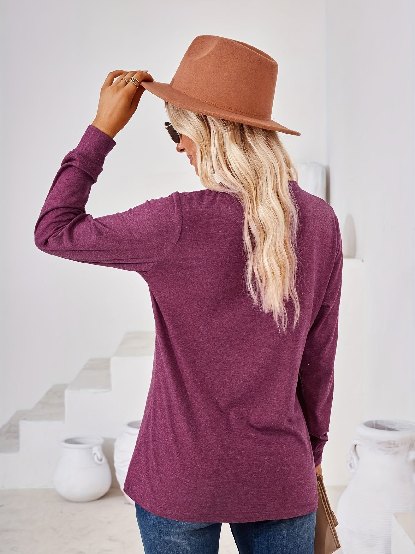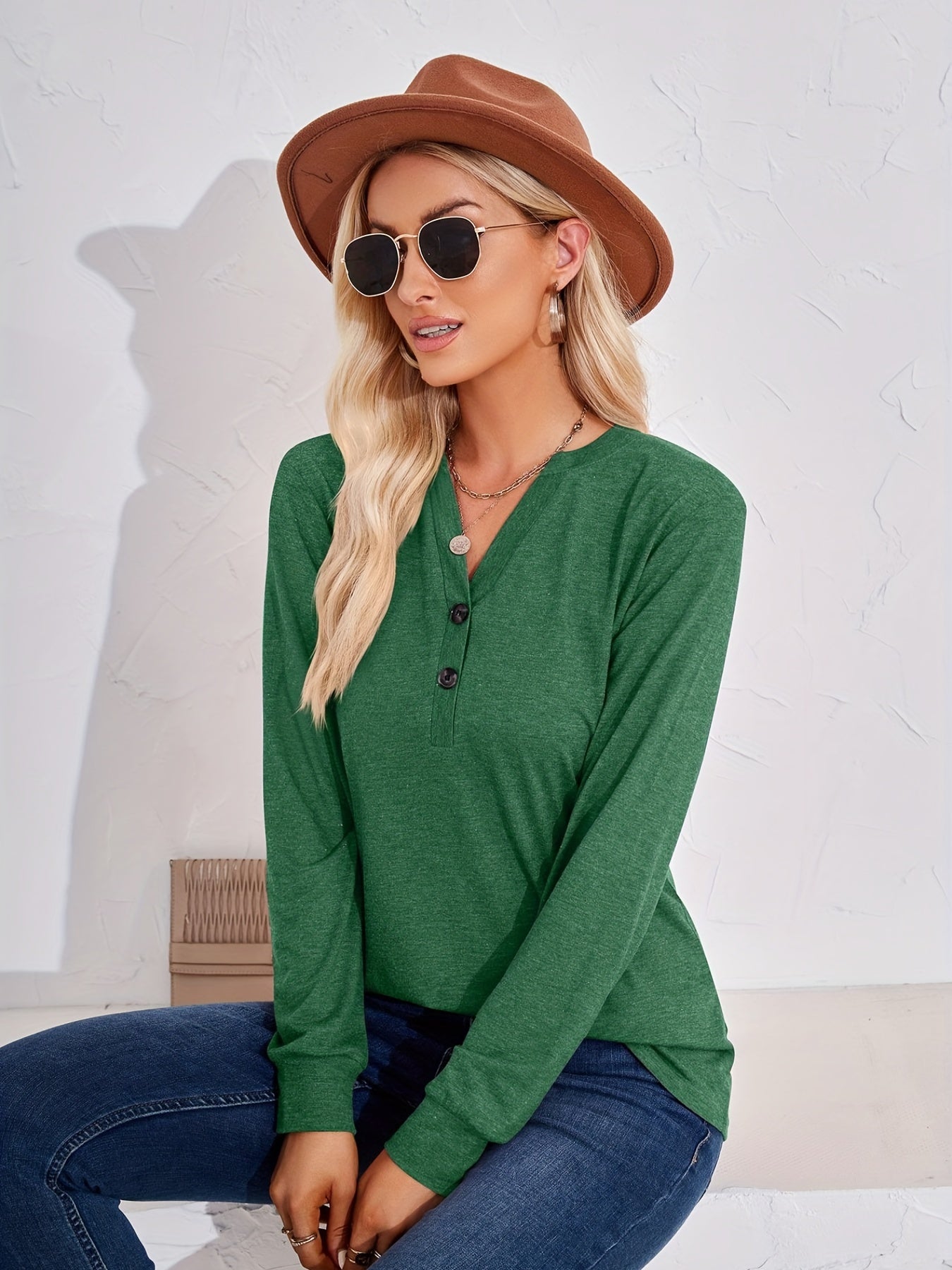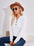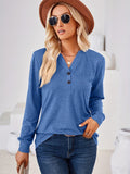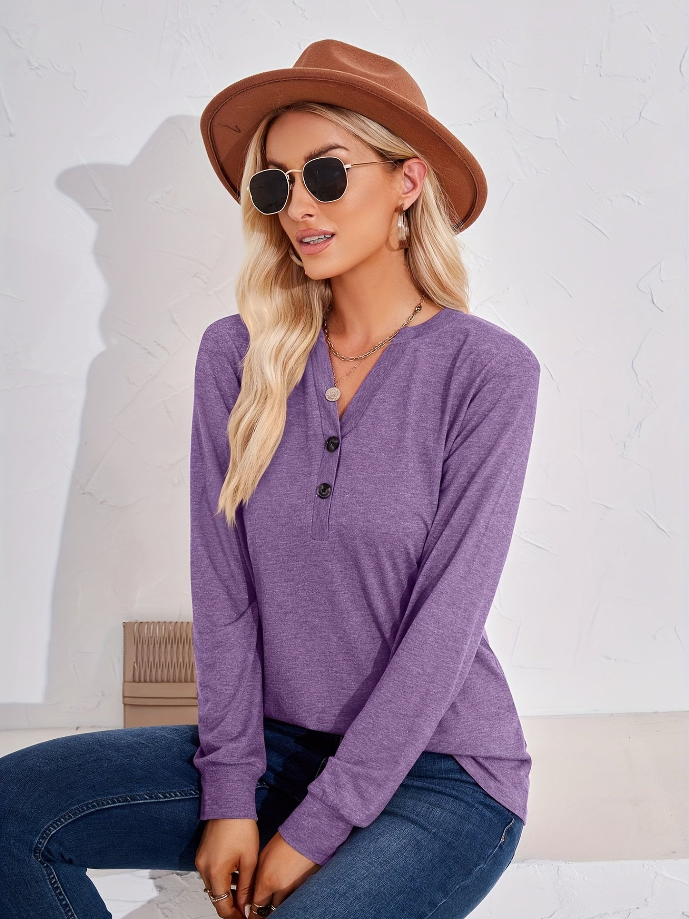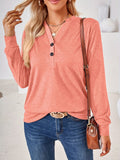 Solid Long Sleeve Button Decor Notched Neck Slight Stretch Tee