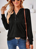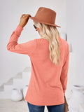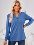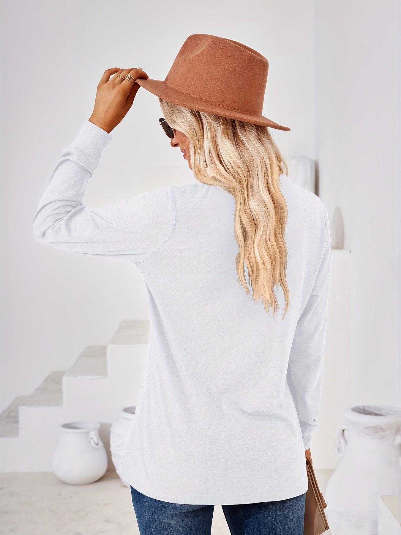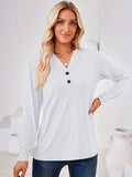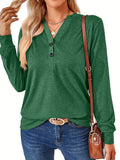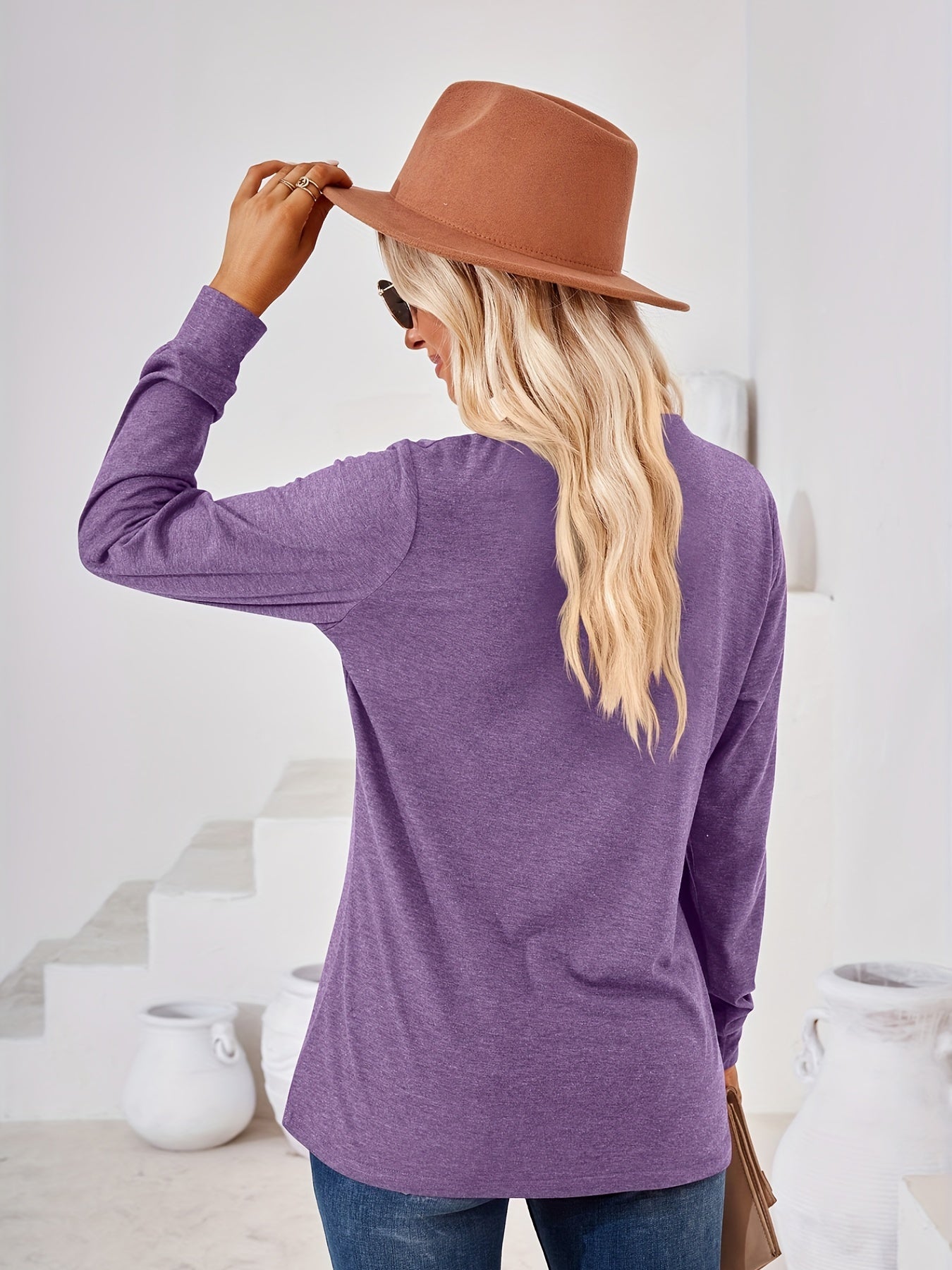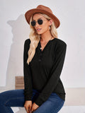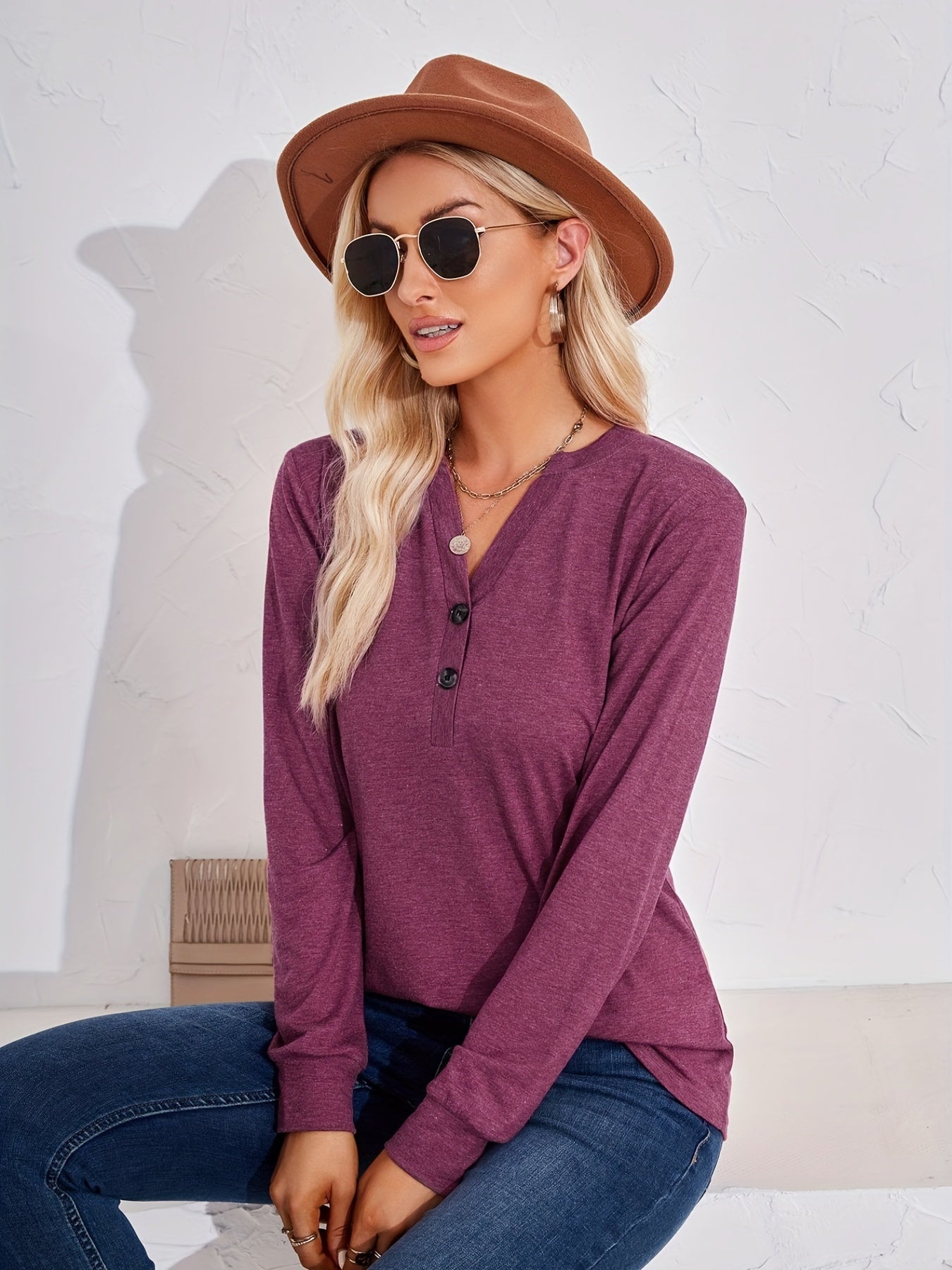 Solid Long Sleeve Button Decor Notched Neck Slight Stretch Tee