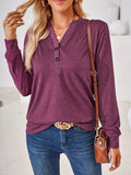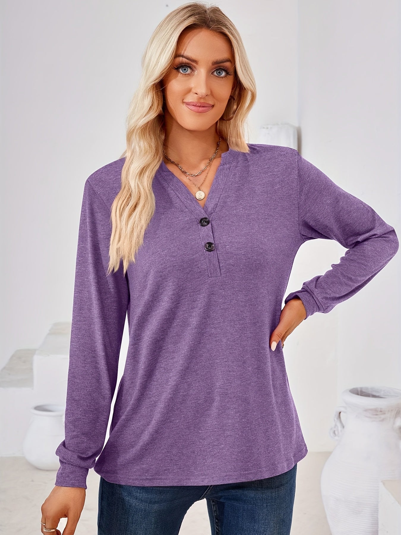 Sale Solid Long Sleeve Button Decor Notched Neck Slight Stretch Tee