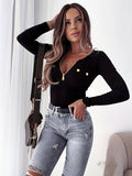 Sale Striped Botton Crew Neck T-Shirt, Elegant Long Sleeve T-Shirt