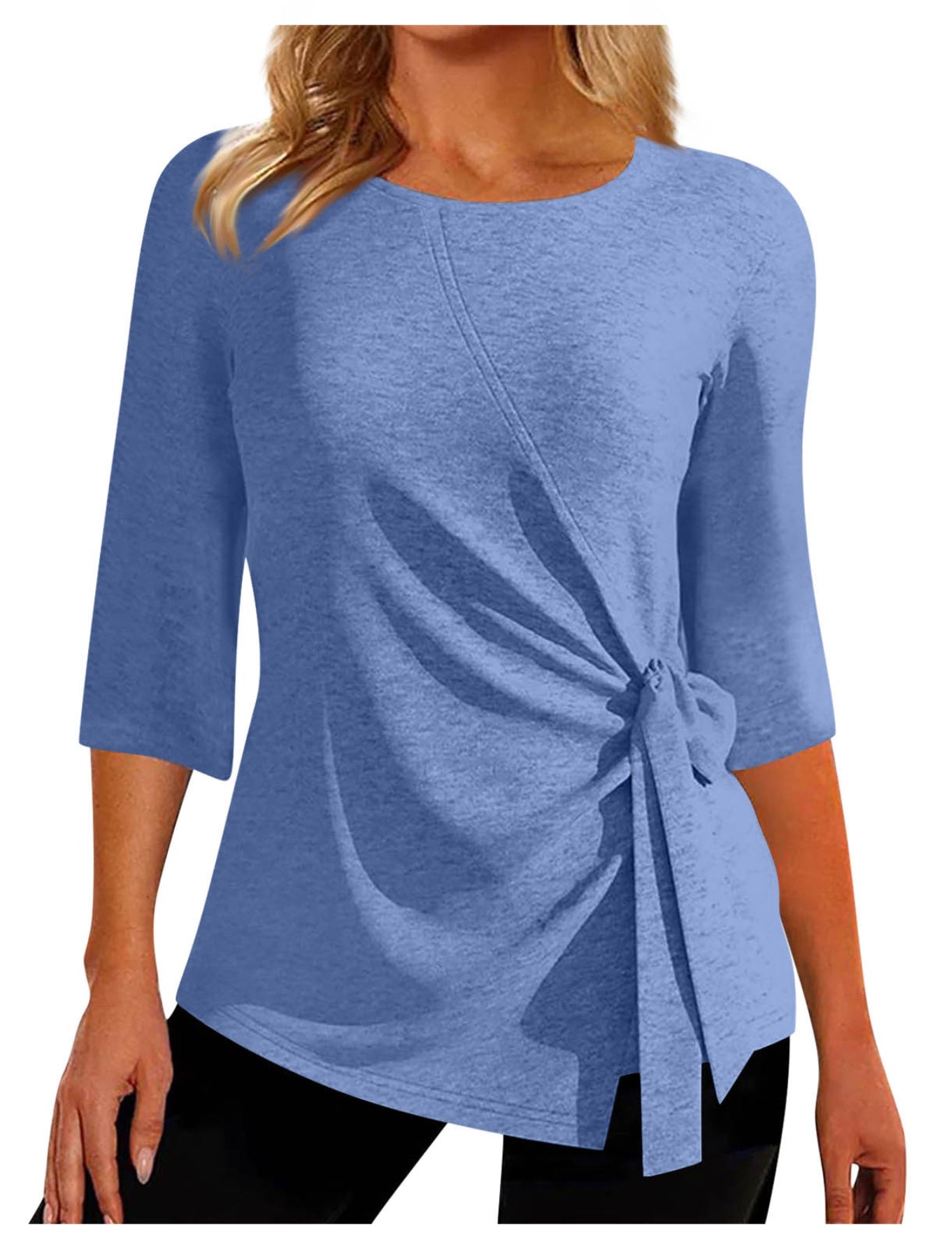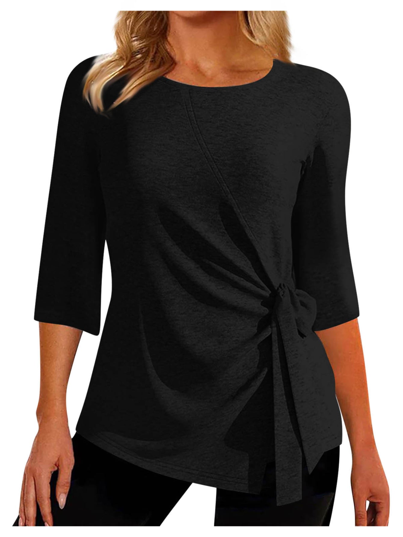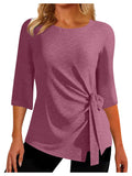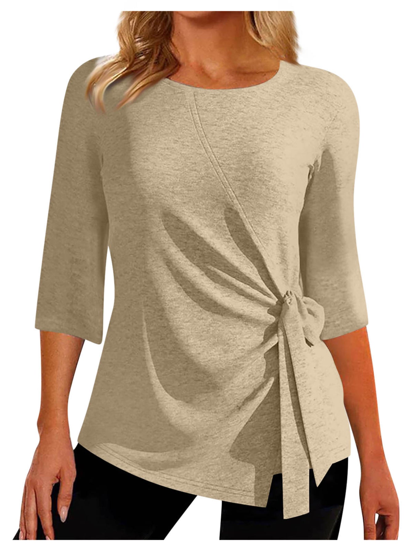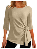 Sale Solid Ruched Tie Front Top, Casual Three-quarter Sleeve Top